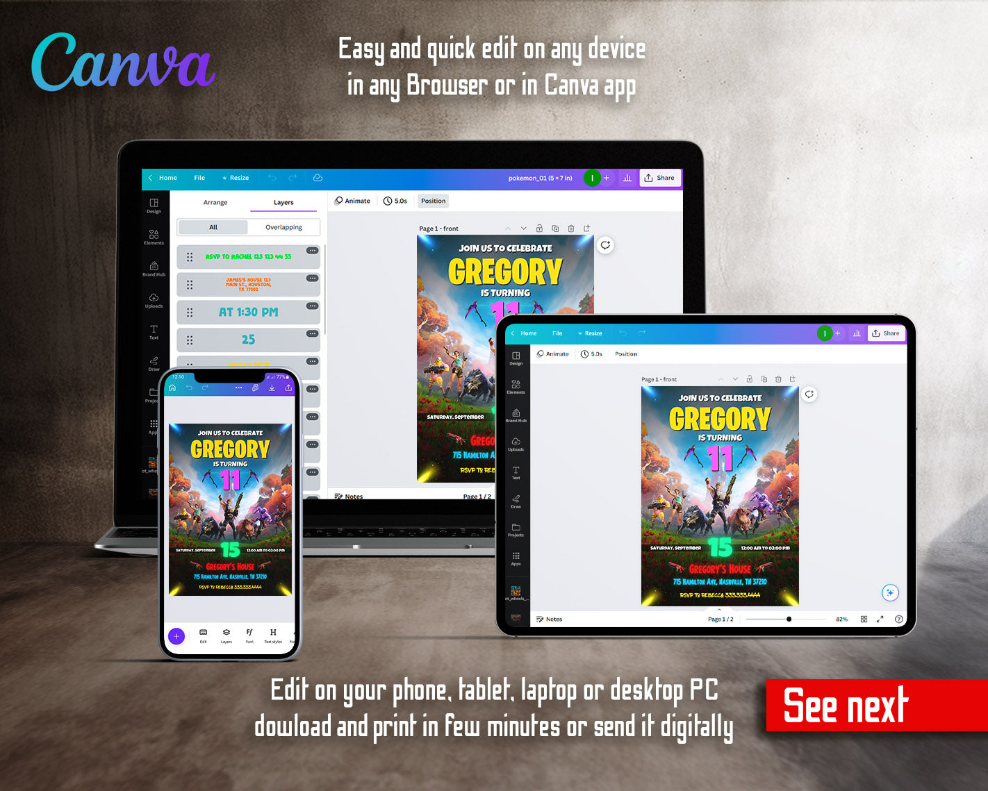 All the invitations are for self-editing. You will edit your template in Canva. It’s easy whether you're using the web browser or the app.
