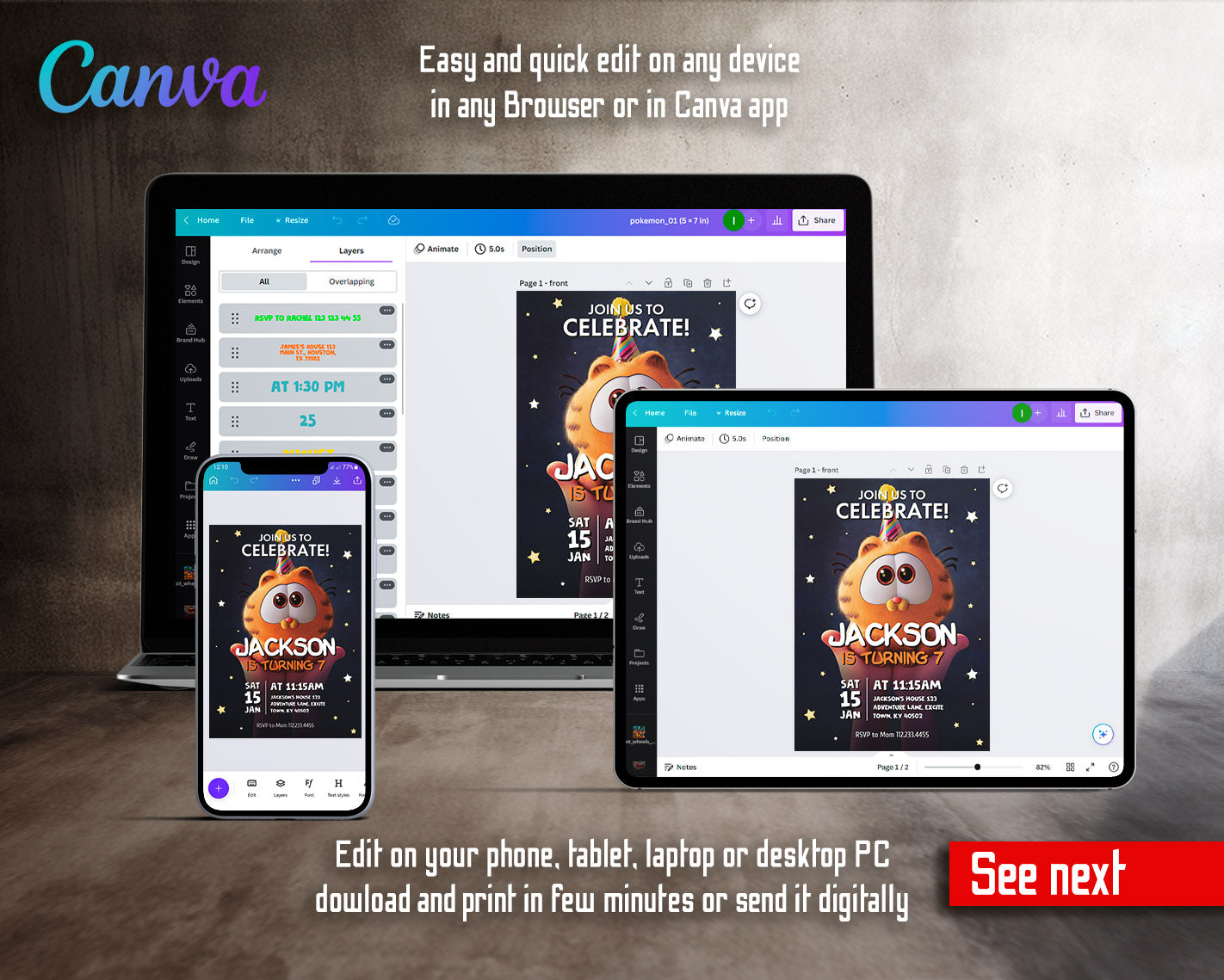 Related Tags: Garfield birthday, Garfield invite, Garfield invitation, movie party, boy girl birthday, orange cat invite, Garfield party, invitation, 1st 2nd 3rd bday, editable invitation, birthday invitation, printable invitation, invite template