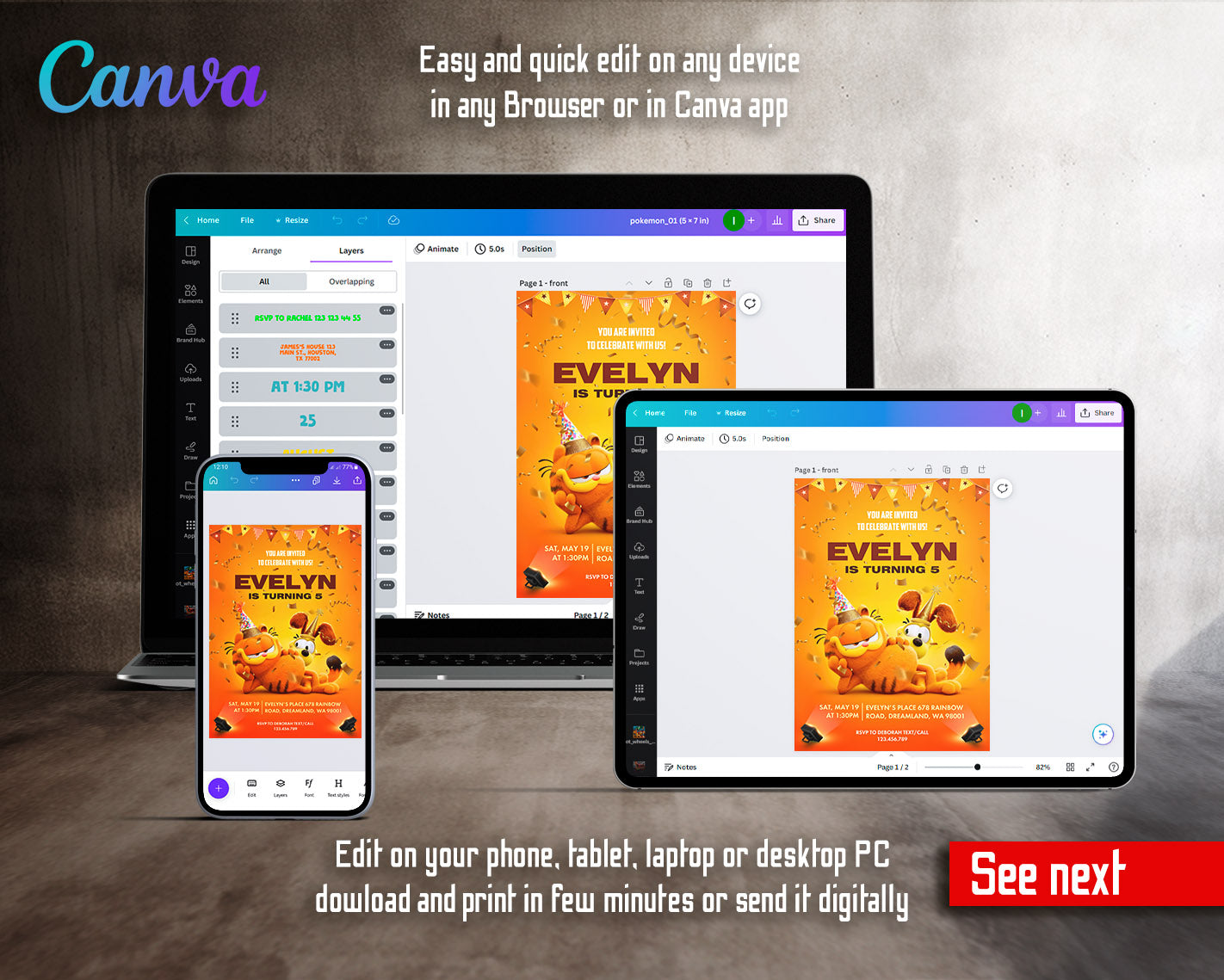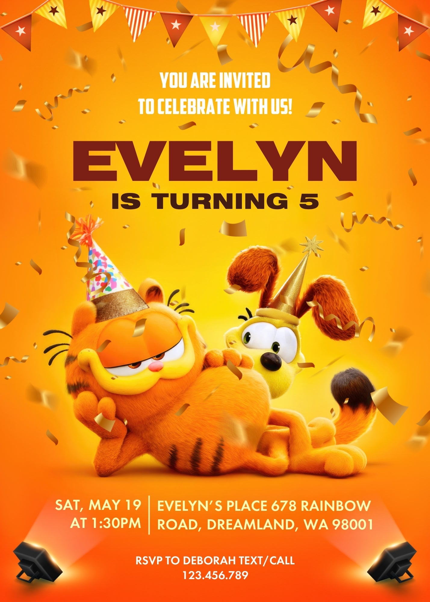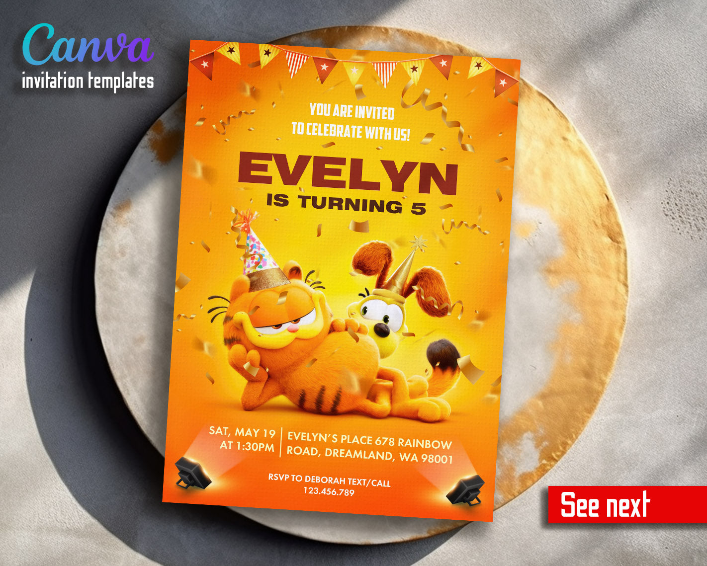 Related Tags: Garfield birthday, Garfield invite, Garfield invitation, movie party, boy girl birthday, orange cat invite, Garfield party, invitation, 1st 2nd 3rd bday, editable invitation, birthday invitation, printable invitation, invite template