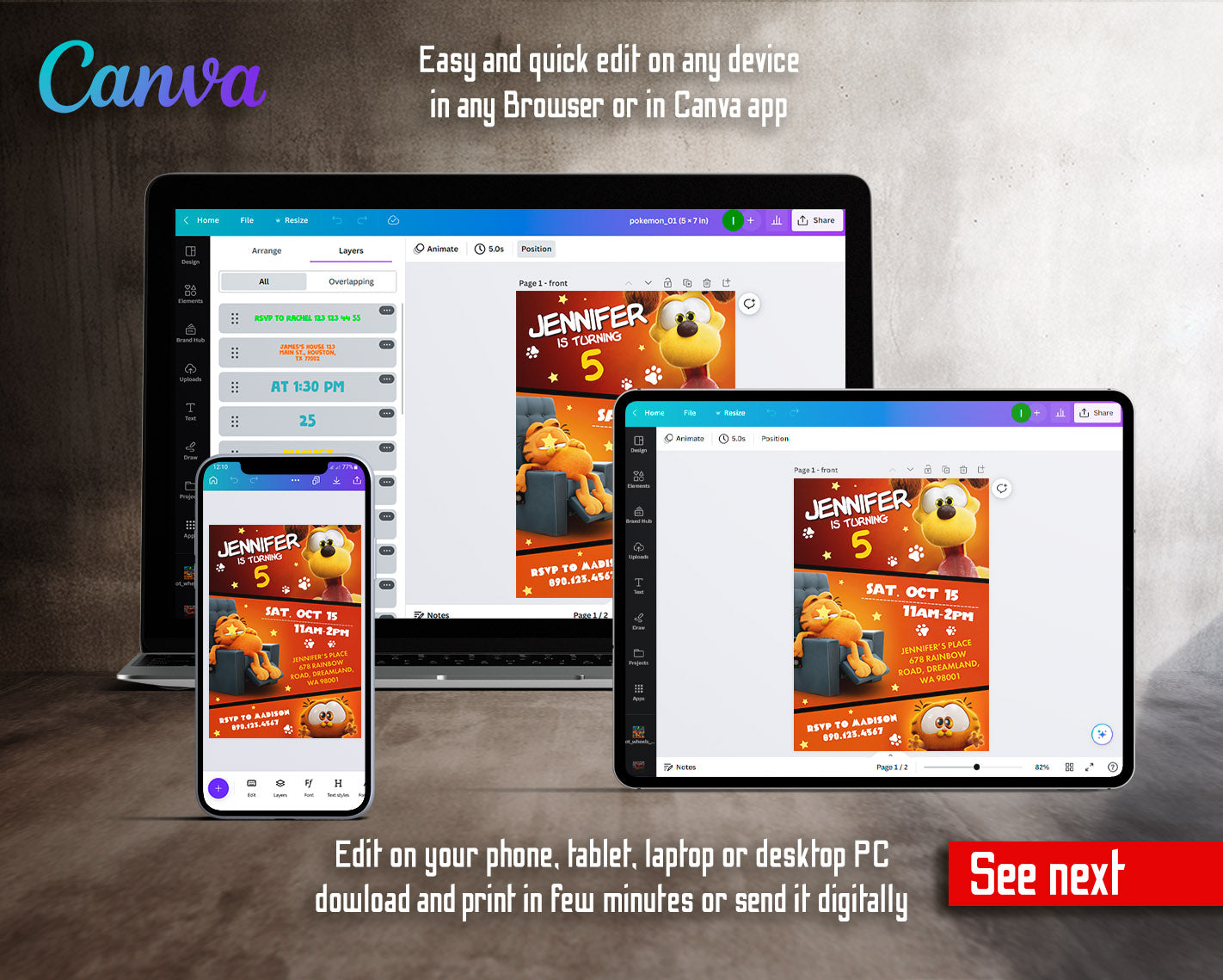 All the invitations are for self-editing. You will edit your template in Canva. It’s easy whether you're using the web browser or the app.