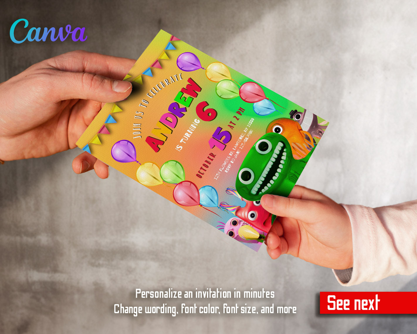 How it works: After the purchase you get a file attached to your order with links to edit your invitation in Canva. You can change the wording and even customize the colors, sizes and fonts of the wording in text blocks. This digital invite can be printed or text messaged.