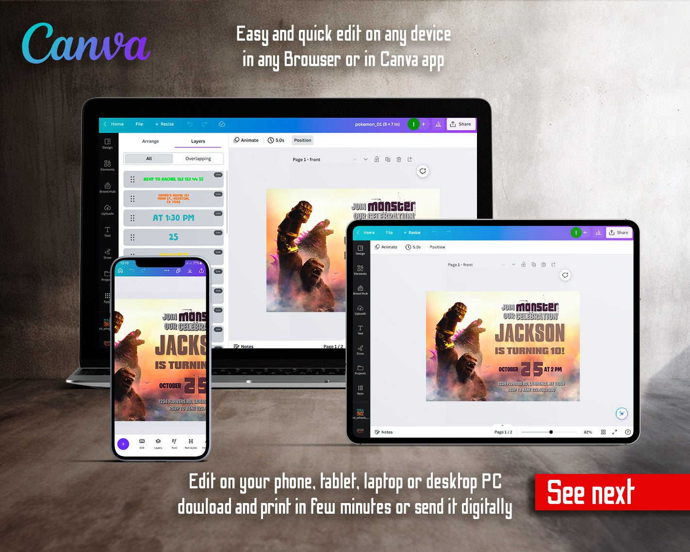 Related Tags: boy birthday, godzilla kong invite, king kong invite, godzilla party, godzila kong party, digital invite, editable invitation, birthday invitation, printable invitation, invite template, evite, instant download , boy birthday