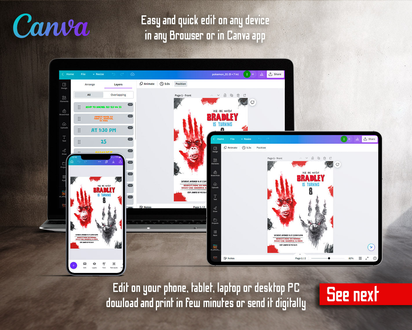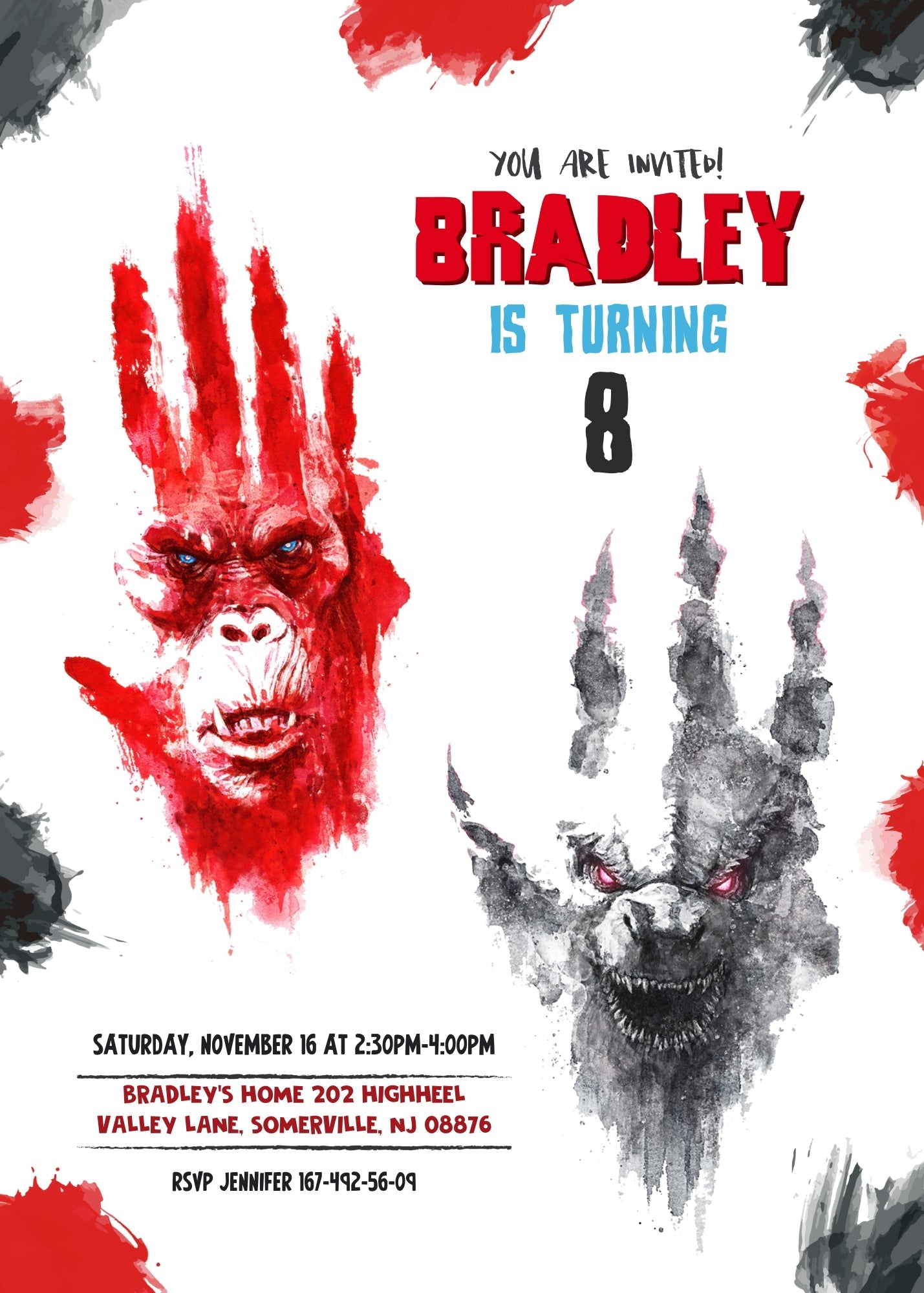 Related Tags: boy birthday, godzilla kong invite, king kong invite, godzilla party, godzila kong party, digital invite, editable invitation, birthday invitation, printable invitation, invite template, evite, instant download , boy birthday