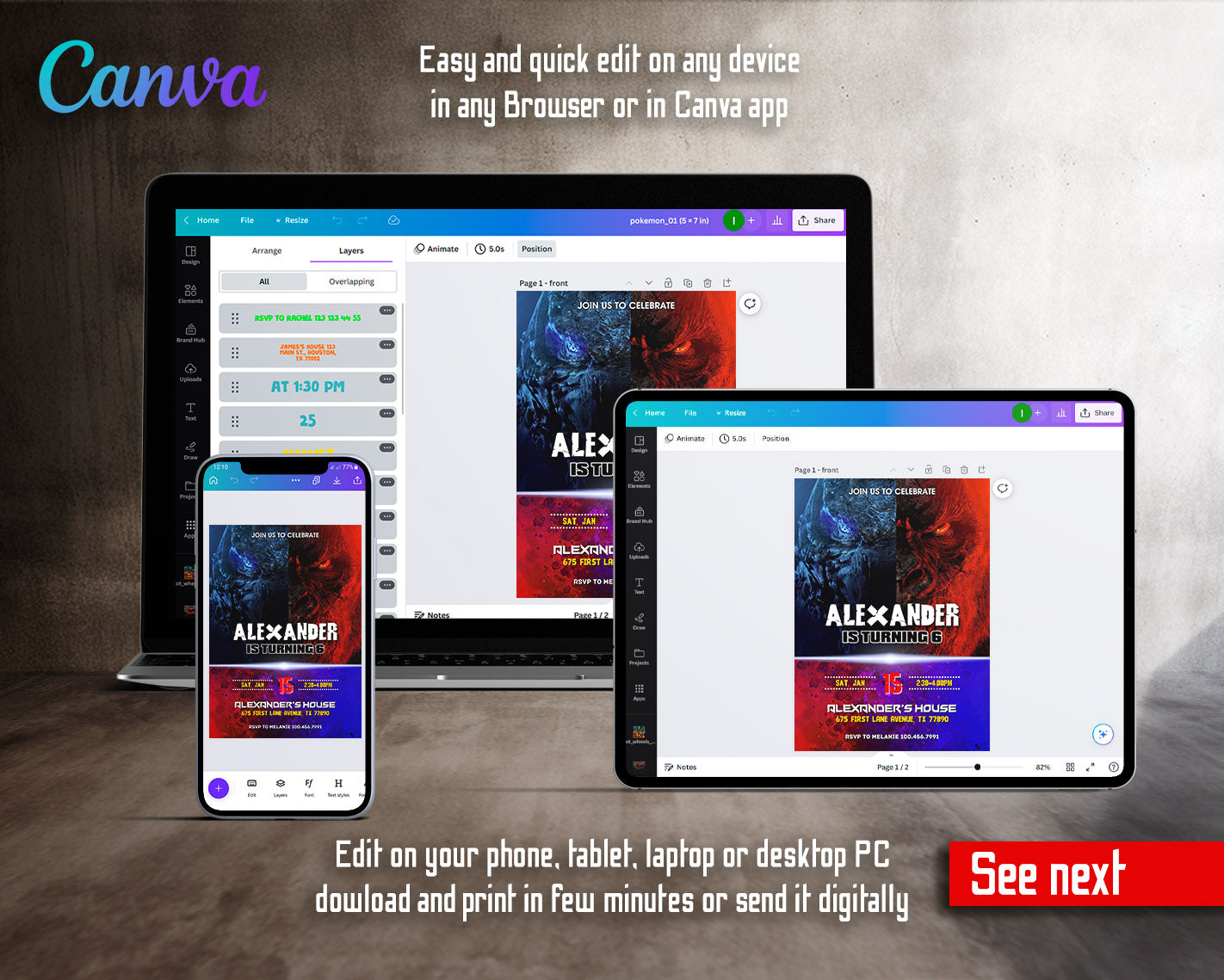 All the invitations are for self-editing. You will edit your template in Canva. It’s easy whether you're using the web browser or the app.