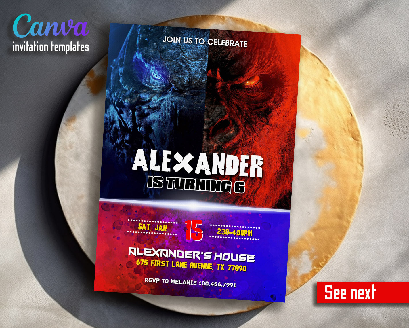 Related Tags: boy birthday, godzilla kong invite, king kong invite, godzilla party, godzila kong party, digital invite, editable invitation, birthday invitation, printable invitation, invite template, evite, instant download , boy birthday