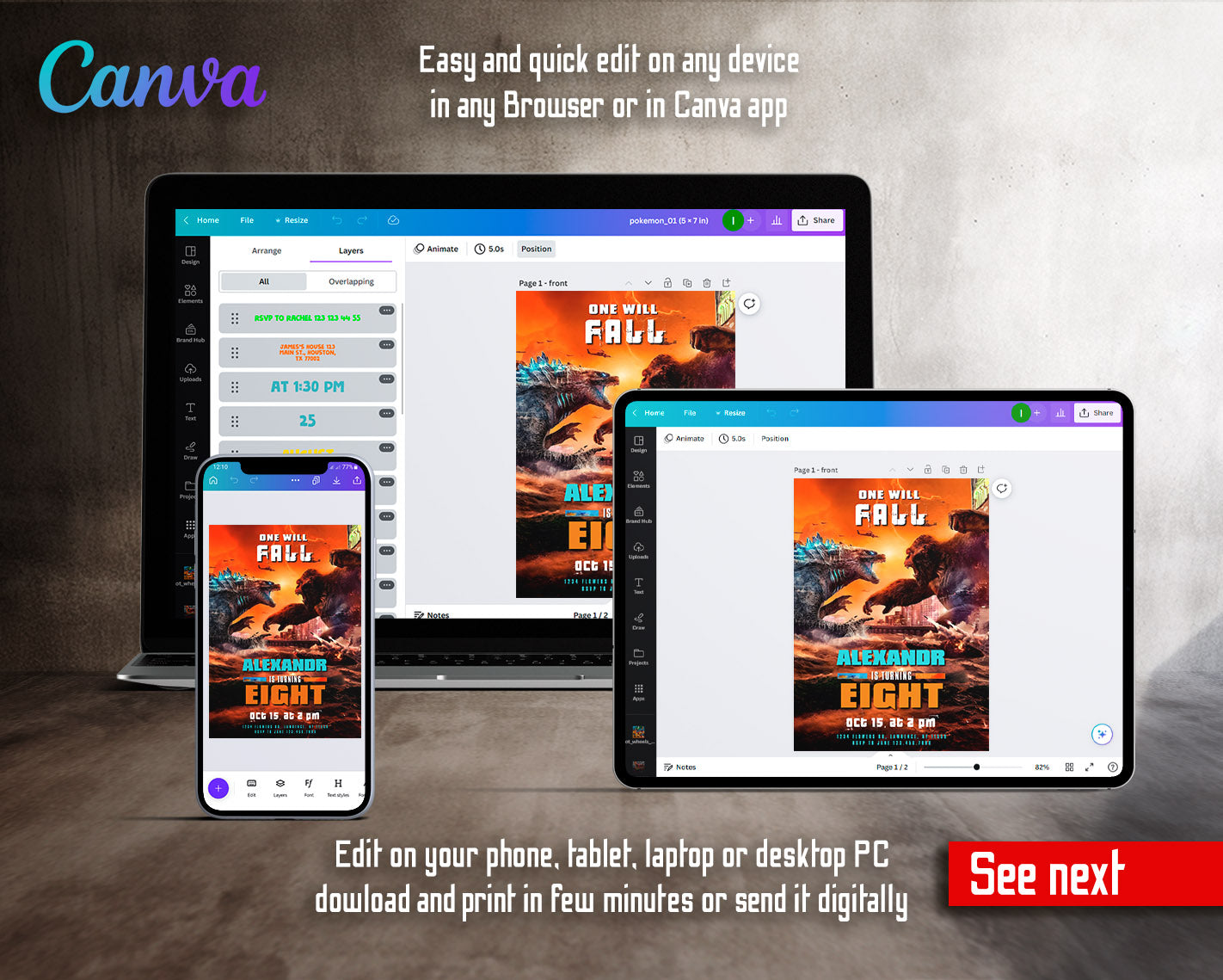 Related Tags: boy birthday, godzilla kong invite, king kong invite, godzilla party, godzila kong party, digital invite, editable invitation, birthday invitation, printable invitation, invite template, evite, instant download , boy birthday