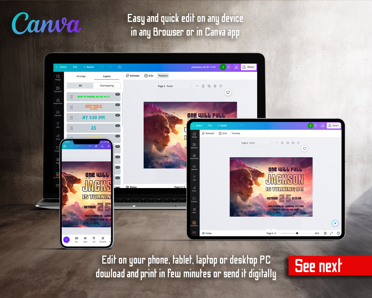 Related Tags: boy birthday, godzilla kong invite, king kong invite, godzilla party, godzila kong party, digital invite, editable invitation, birthday invitation, printable invitation, invite template, evite, instant download , boy birthday