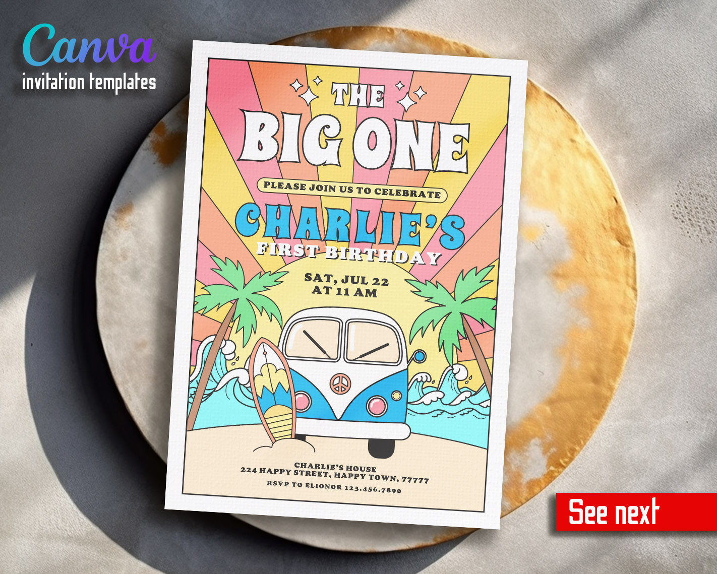 Related Tags: 1st party invite, surfing Birthday, surfvan Birthday, surfvan invitation, first birthday, big one invite, Groovy invitation, Groovy one, Groovy Party, Groovy Theme bday, Hippie Invitation, printable editable, Retro Birthday