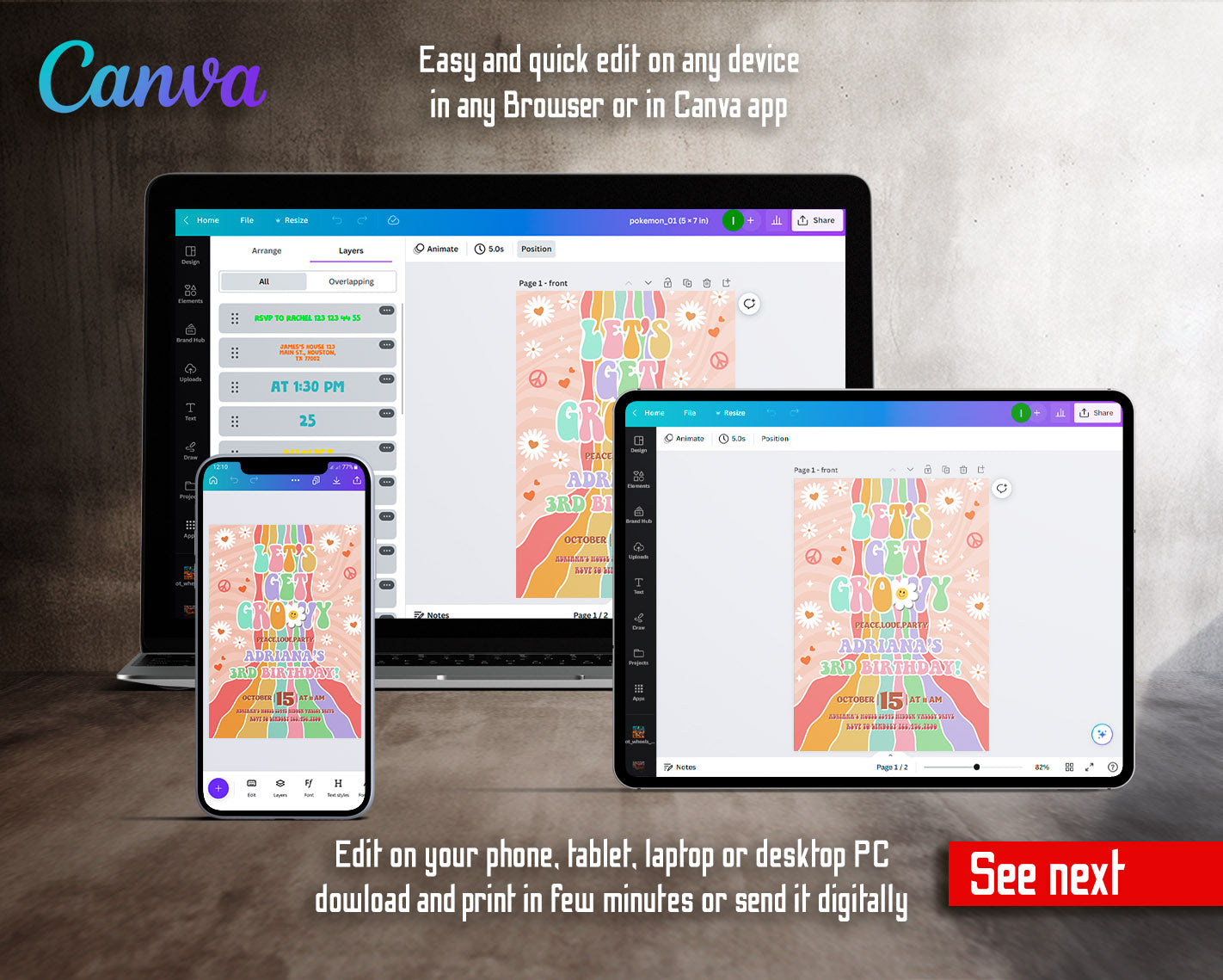 All the invitations are for self-editing. You will edit your template in Canva. It’s easy whether you're using the web browser or the app.