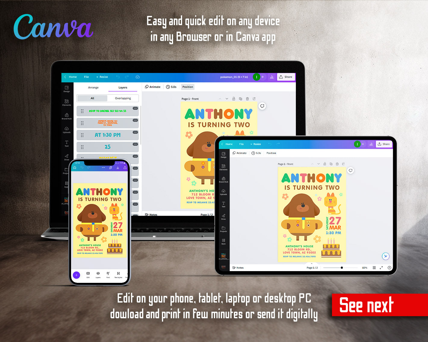 All the invitations are for self-editing. You will edit your template in Canva. It’s easy whether you're using the web browser or the app.