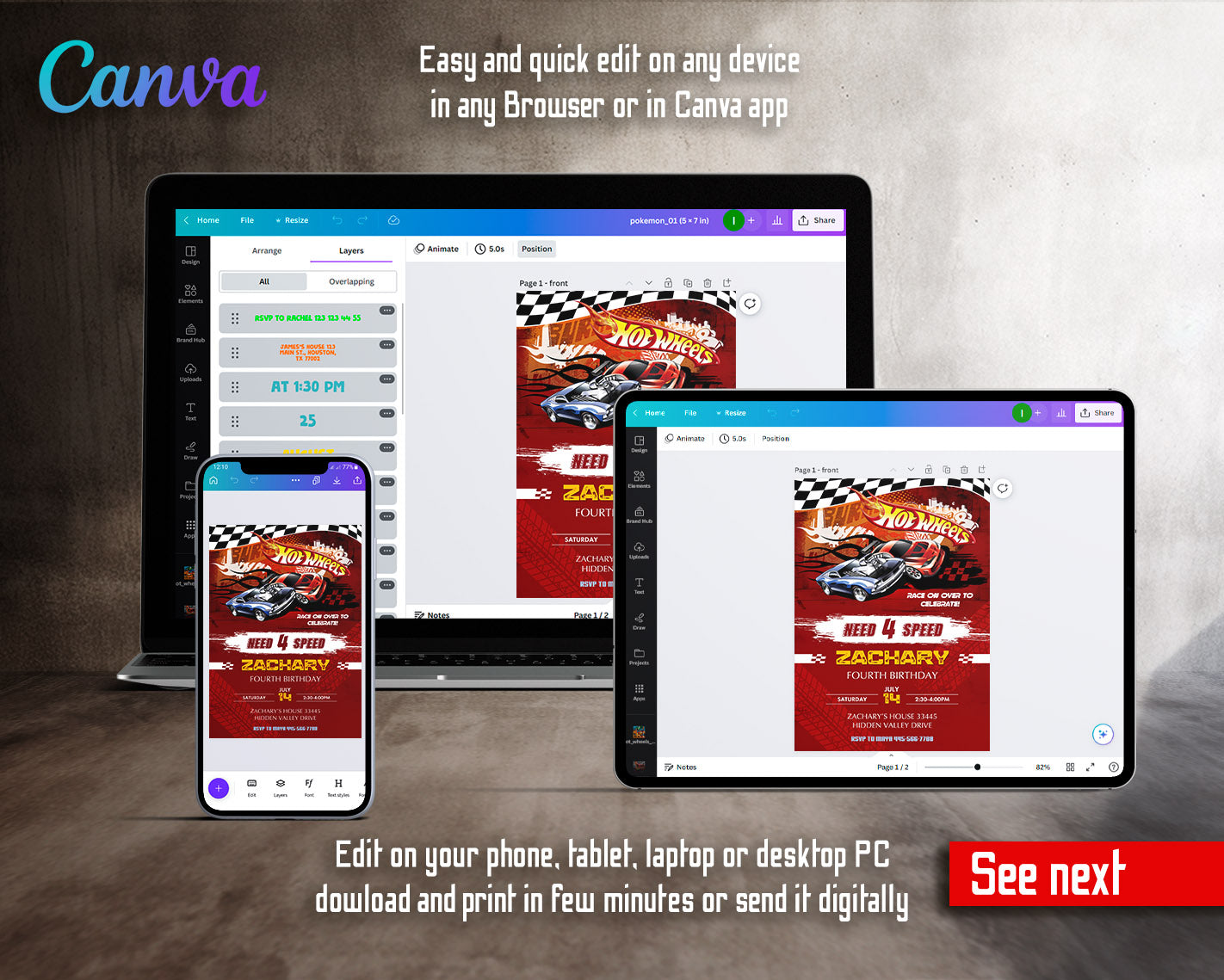 Related Tags: hot invitation, hot wheels birthday, hot wheels invite, cars invitation, racing party, need four speed bday, editable invitation, birthday invitation, printable invitation, invite template, 4th birthday party, girl birthday, boy birthday