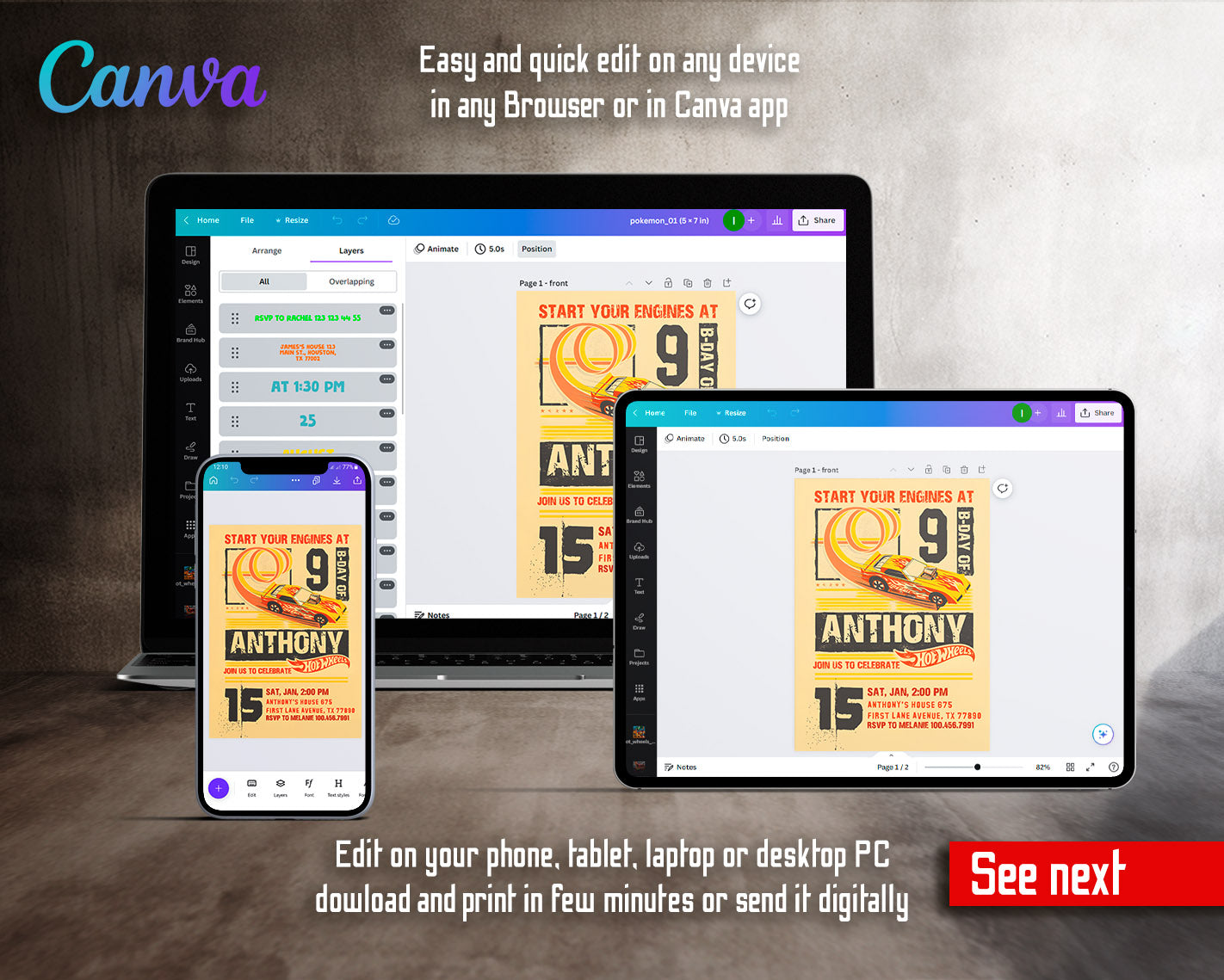 Related Tags: hot invitation, hot wheels birthday, hot wheels invite, cars invitation, racing party, digital invite, editable invitation, birthday invitation, printable invitation, invite template, evite, girl birthday, boy birthday