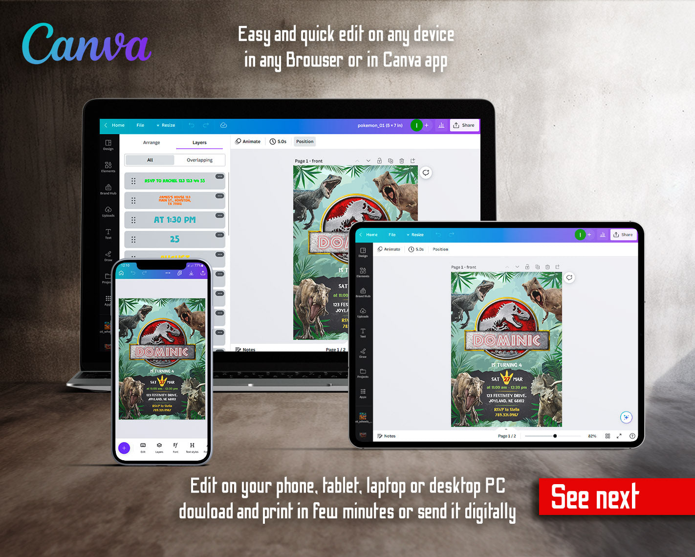 All the invitations are for self-editing. You will edit your template in Canva. It’s easy whether you're using the web browser or the app.