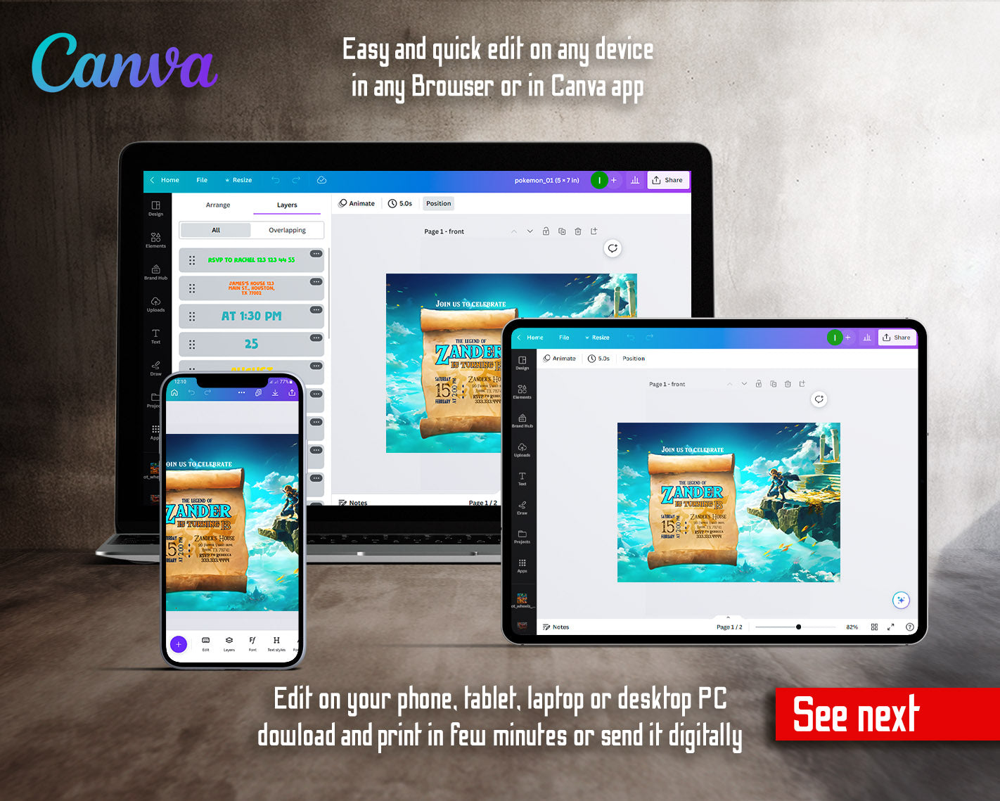 All the invitations are for self-editing. You will edit your template in Canva. It’s easy whether you're using the web browser or the app.