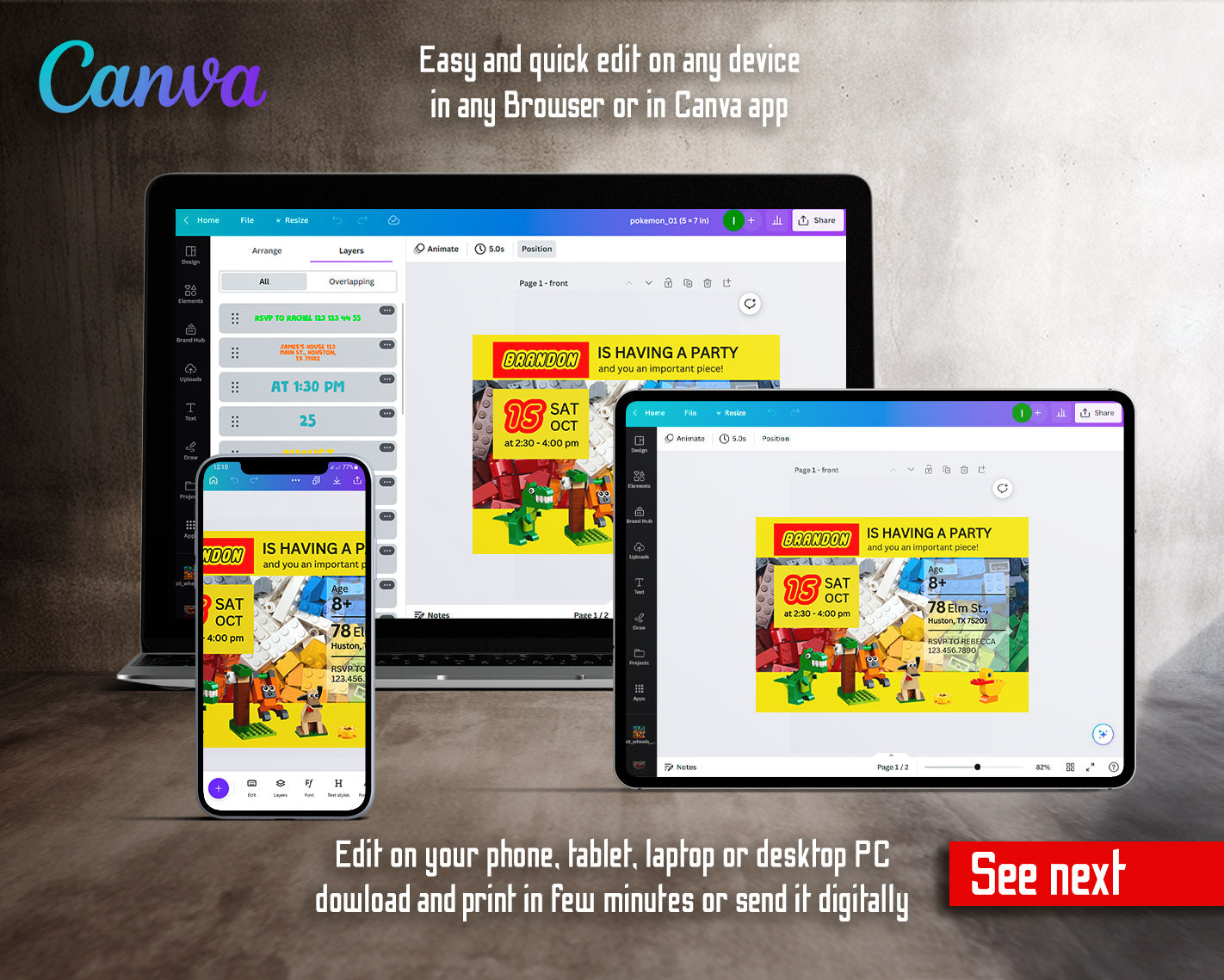 Related Tags: lego invitation, lego birthday, building blocks, lego invite, lego party, bricks invitation, editable invitation, birthday invitation, printable invitation, invite template, ninjago evite, constructor invite, boy birthday
