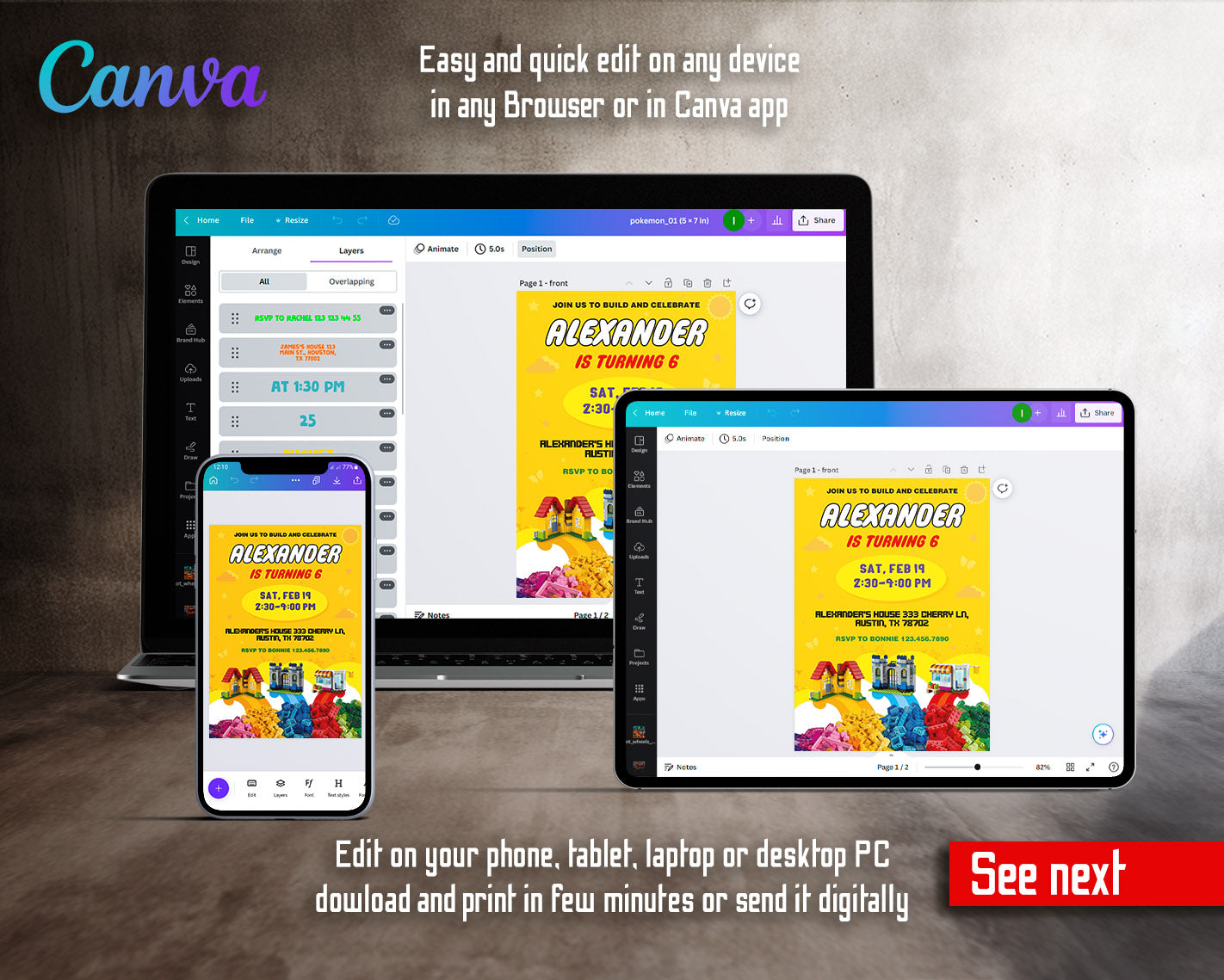 All the invitations are for self-editing. You will edit your template in Canva. It’s easy whether you're using the web browser or the app.