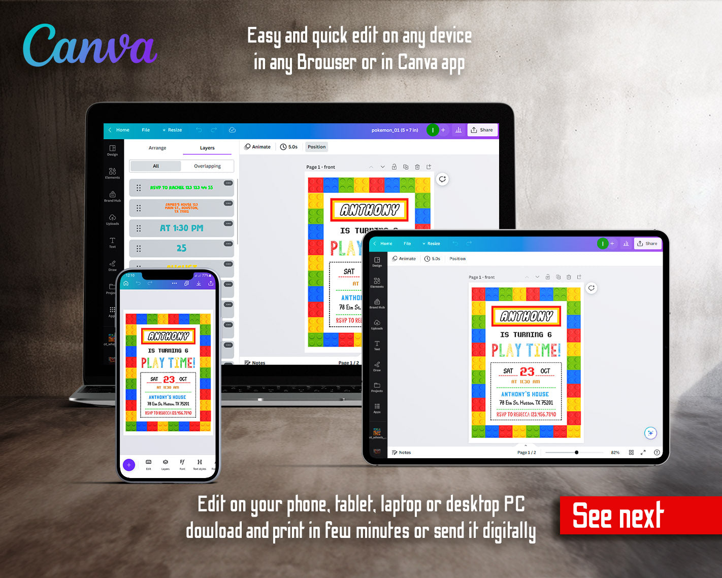 Related Tags: lego invitation, lego birthday, building blocks, lego invite, lego party, bricks invitation, editable invitation, birthday invitation, printable invitation, invite template, ninjago evite, constructor invite, boy birthday