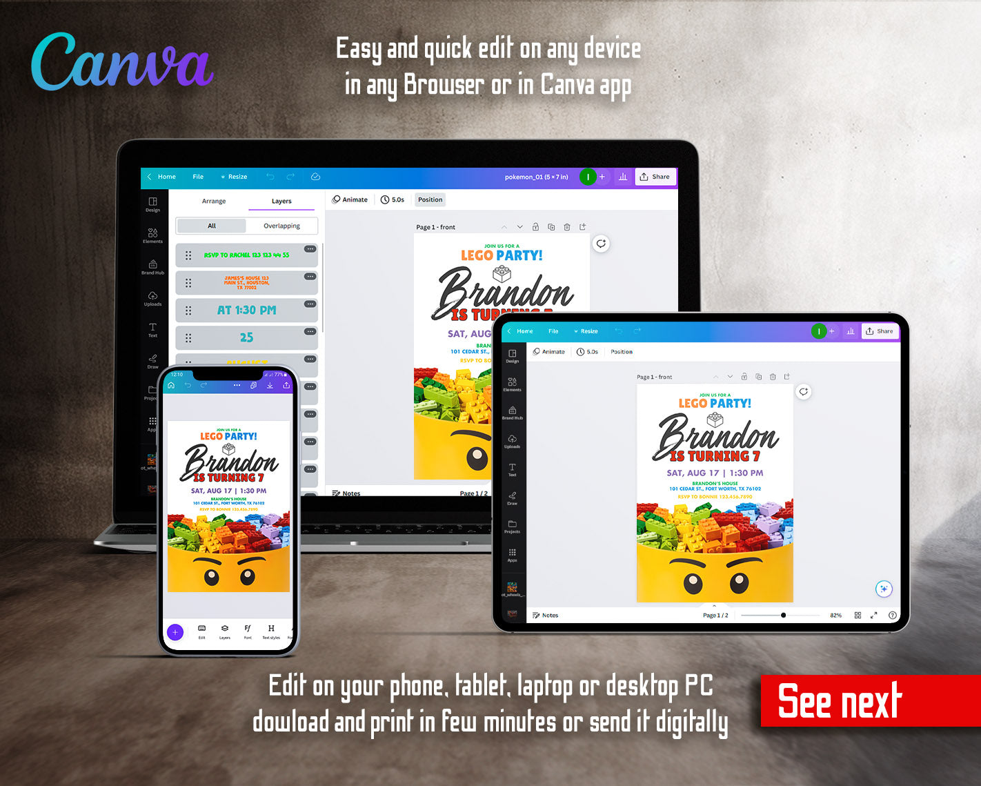 All the invitations are for self-editing. You will edit your template in Canva. It’s easy whether you're using the web browser or the app.
