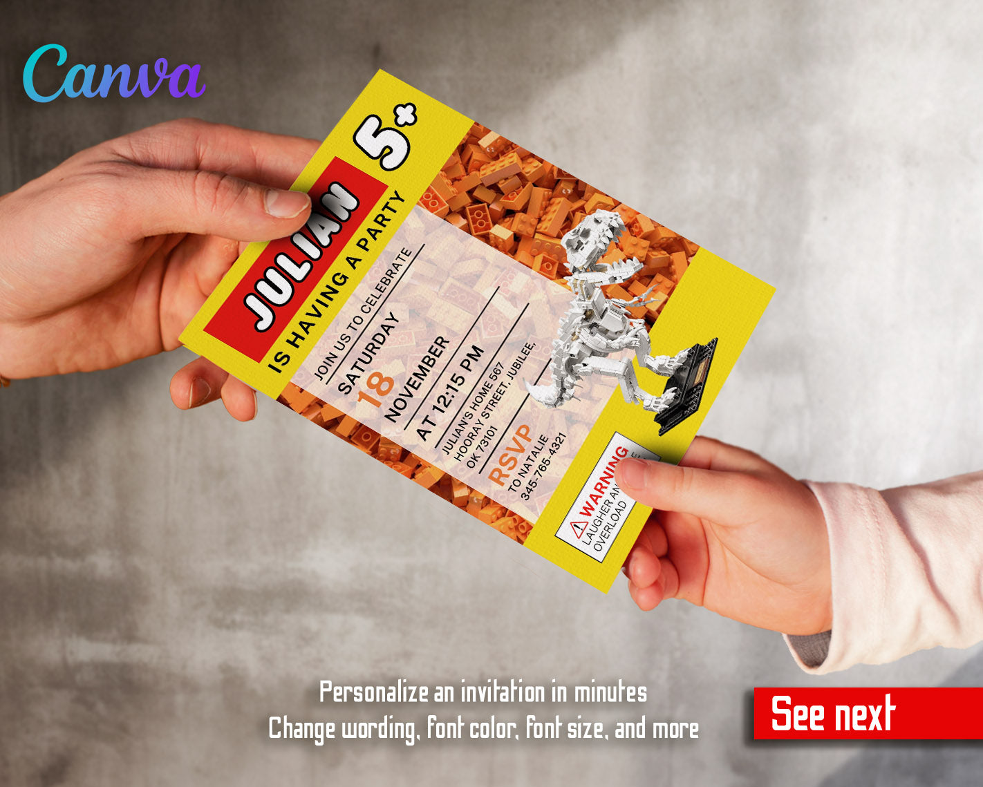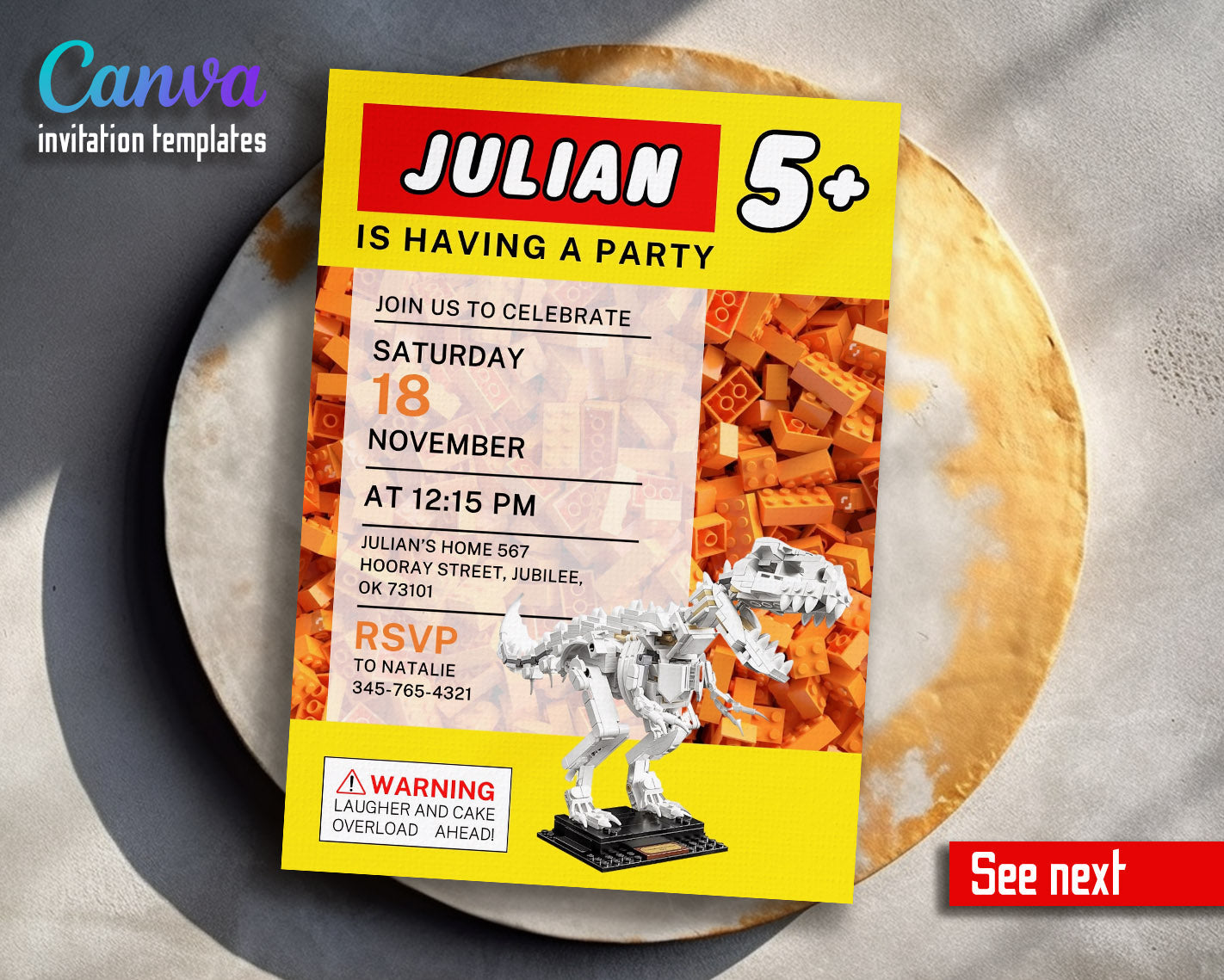 Related Tags: lego invitation, lego birthday, building blocks, dinosaur invite, dino party, t-rex invitation, editable invitation, birthday invitation, printable invitation, invite template, evite for boys, constructor invite, boy birthday