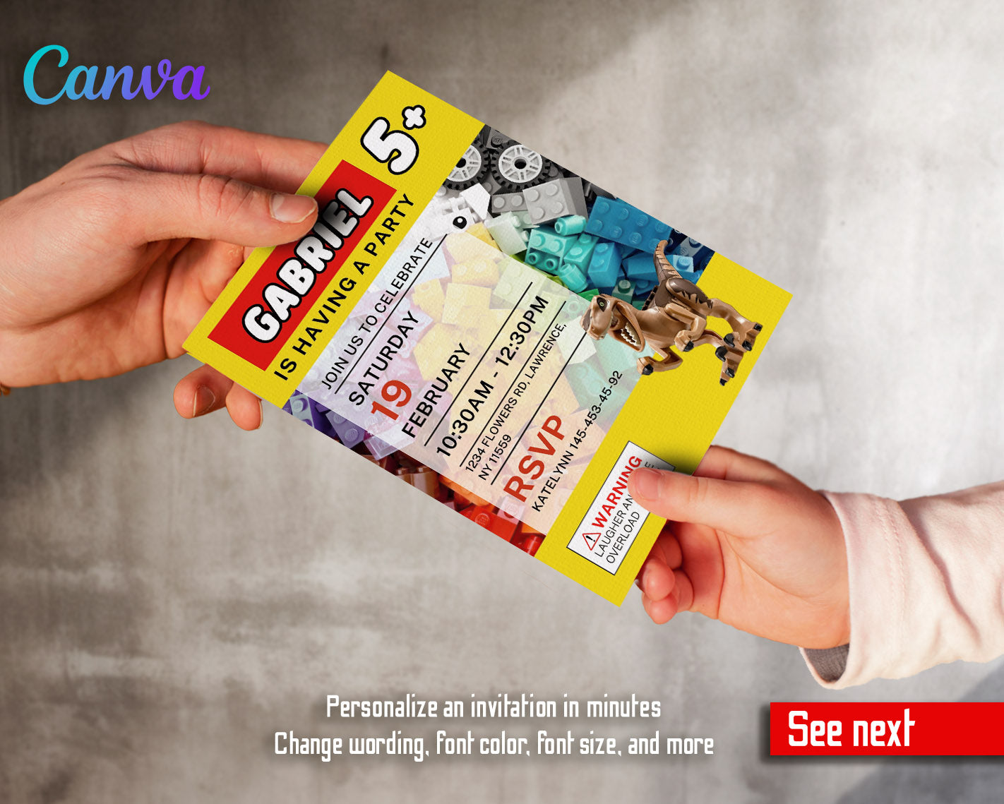 Related Tags: lego invitation, lego birthday, building blocks, dinosaur invite, dino party, t-rex invitation, editable invitation, birthday invitation, printable invitation, invite template, evite for boys, constructor invite, boy birthday