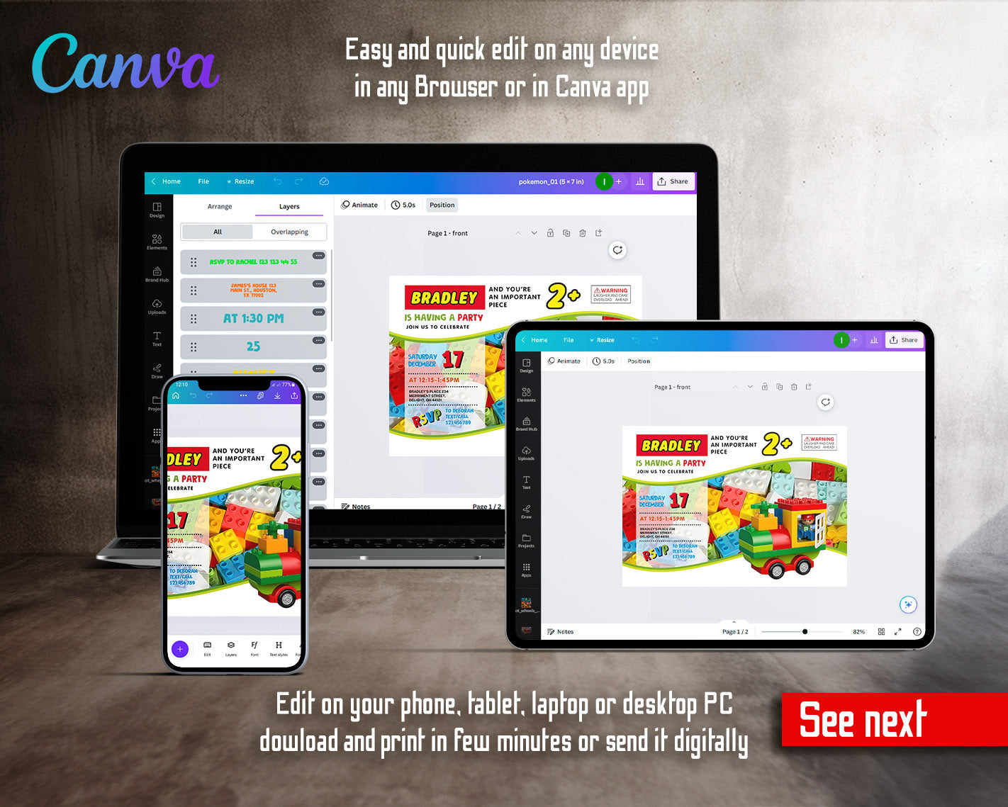 All the invitations are for self-editing. You will edit your template in Canva. It’s easy whether you're using the web browser or the app.