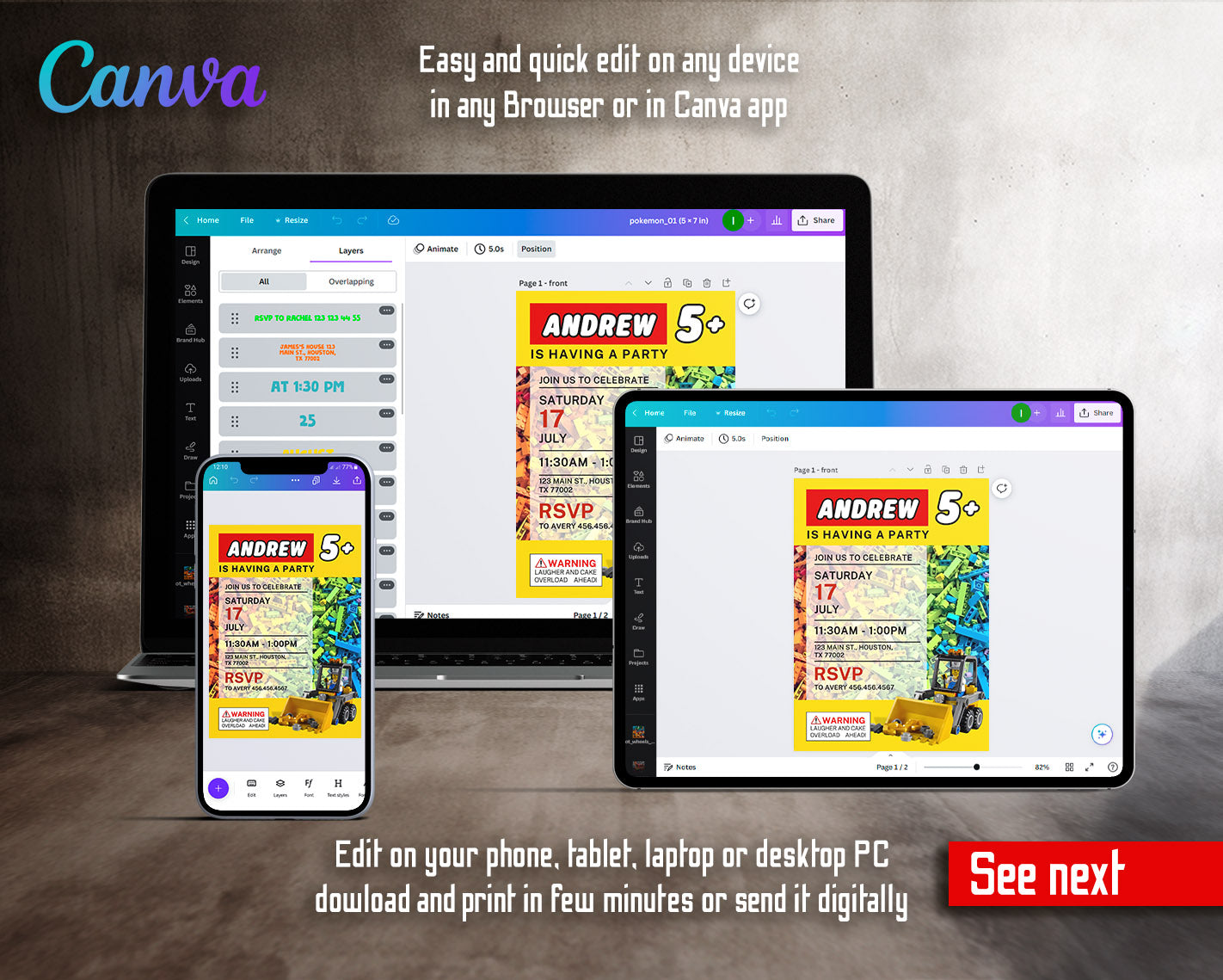 Related Tags: lego invitation, lego birthday, building blocks, excavator invite, construction party, yellow truck invite, editable invitation, birthday invitation, printable invitation, invite template, evite for boys, constructor invite, boy birthday