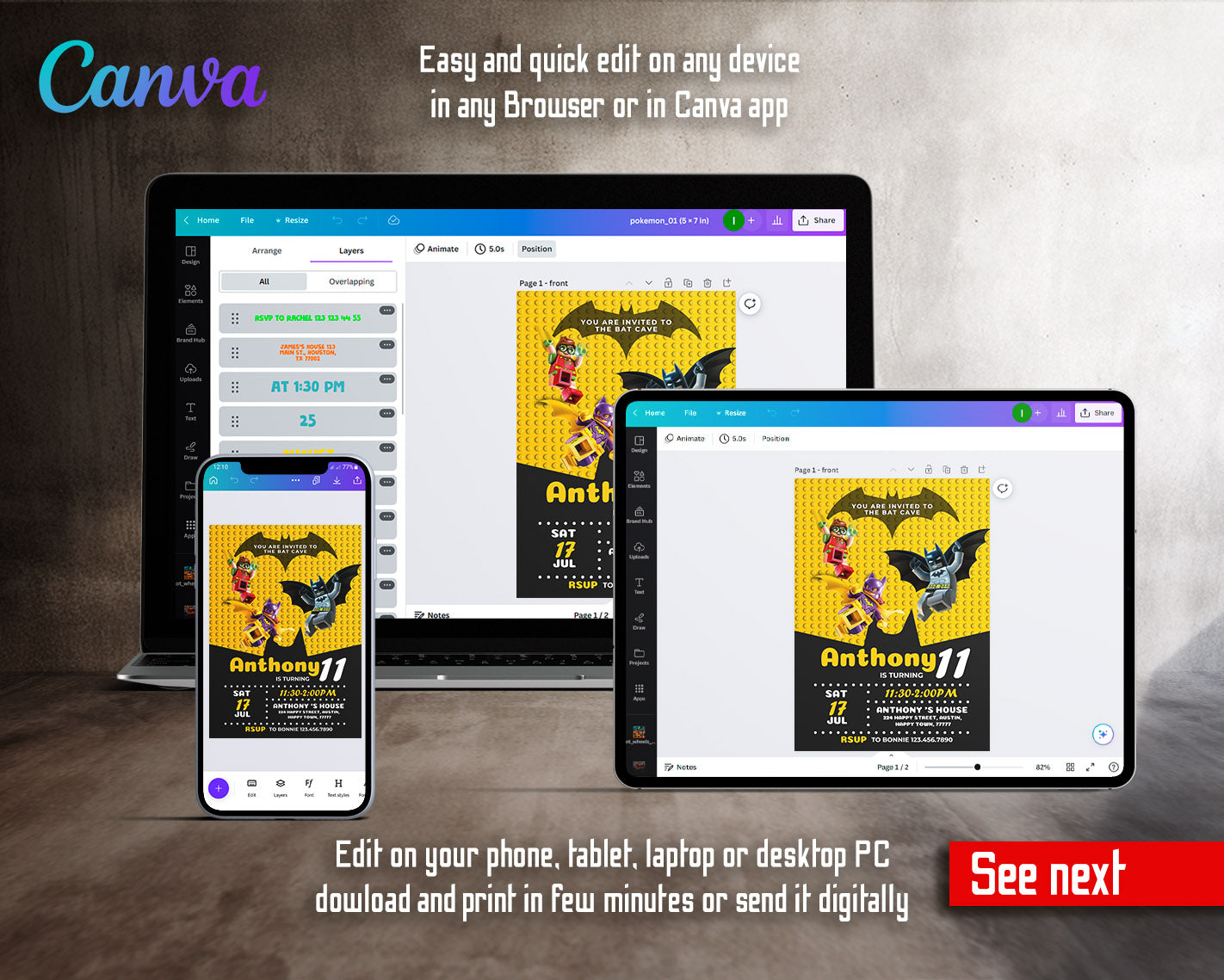 All the invitations are for self-editing. You will edit your template in Canva. It’s easy whether you're using the web browser or the app.