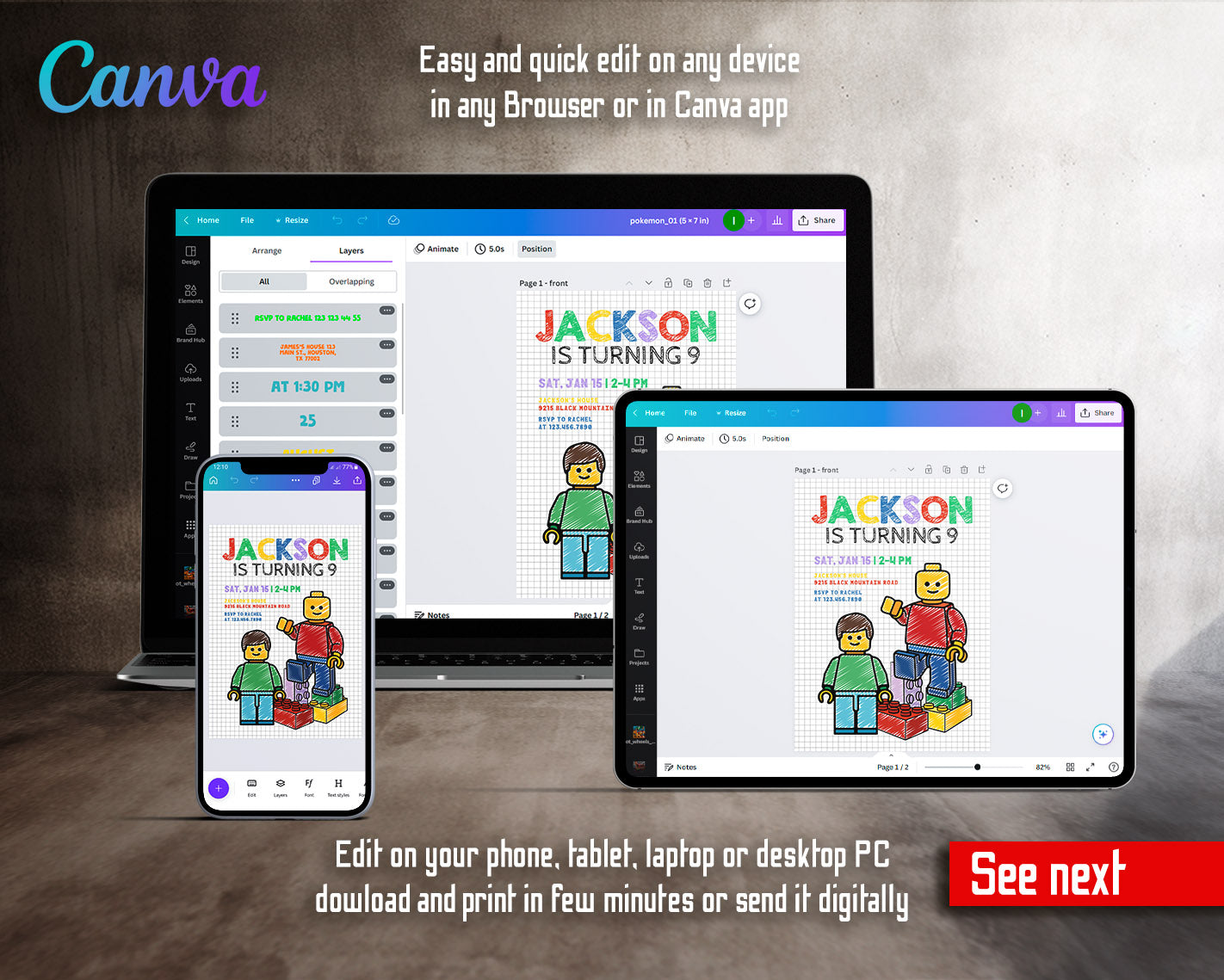 Related Tags: lego invitation, lego birthday, building blocks, lego invite, construction party, digital invite, editable invitation, birthday invitation, printable invitation, invite template, evite, boy birthday, personalized invite