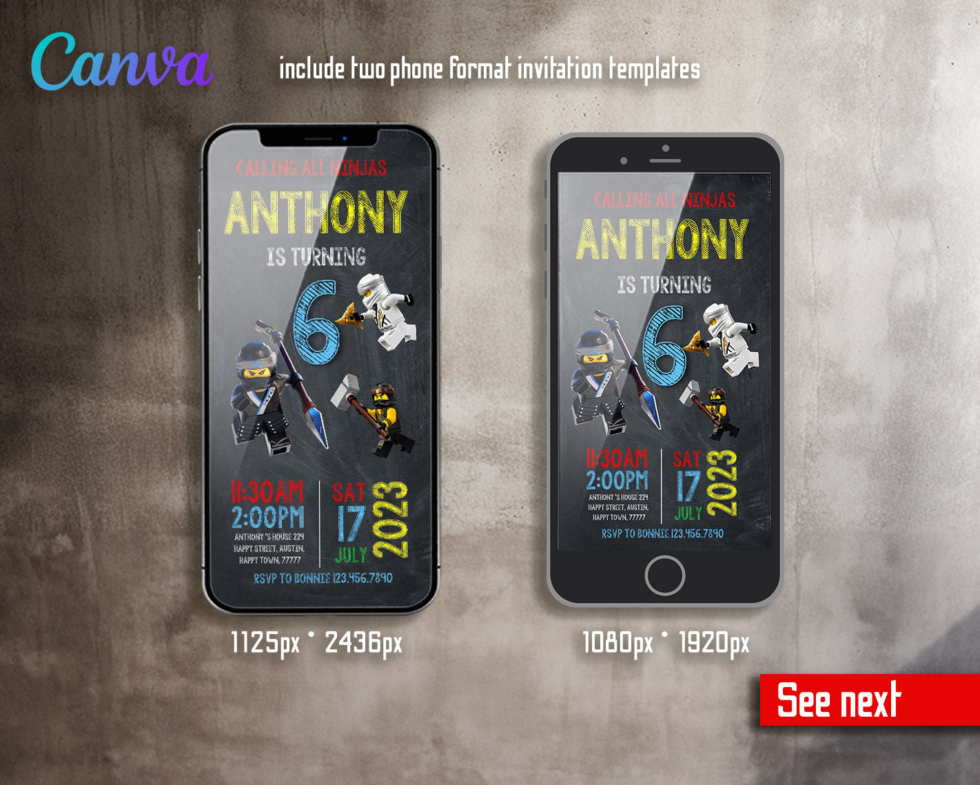 All the invitations are for self-editing. You will edit your template in Canva. It’s easy whether you're using the web browser or the app.