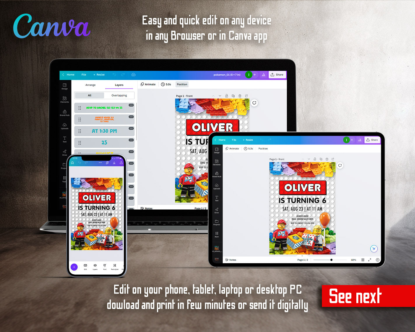Related Tags: lego invitation, lego birthday, building blocks, lego invite, construction party, digital invite, editable invitation, birthday invitation, printable invitation, invite template, evite, boy birthday, personalized invite