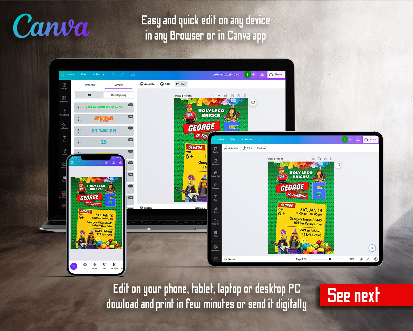 All the invitations are for self-editing. You will edit your template in Canva. It’s easy whether you're using the web browser or the app.