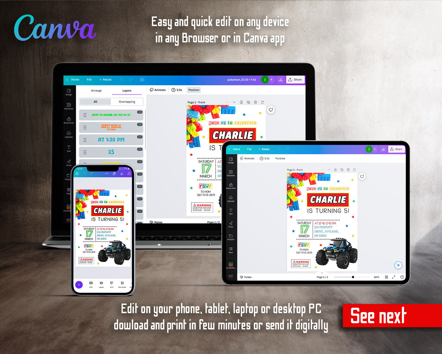 Related Tags: lego invitation, lego birthday, building blocks, race car invite, racing party, monster truck invite, editable invitation, birthday invitation, printable invitation, invite template, evite for boys, constructor invite, boy birthday