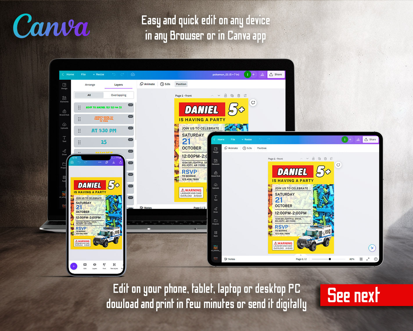 Related Tags: lego invitation, lego birthday, building blocks, police invite, police car party, policeman invitation, editable invitation, birthday invitation, printable invitation, invite template, evite for boys, constructor invite, boy birthday