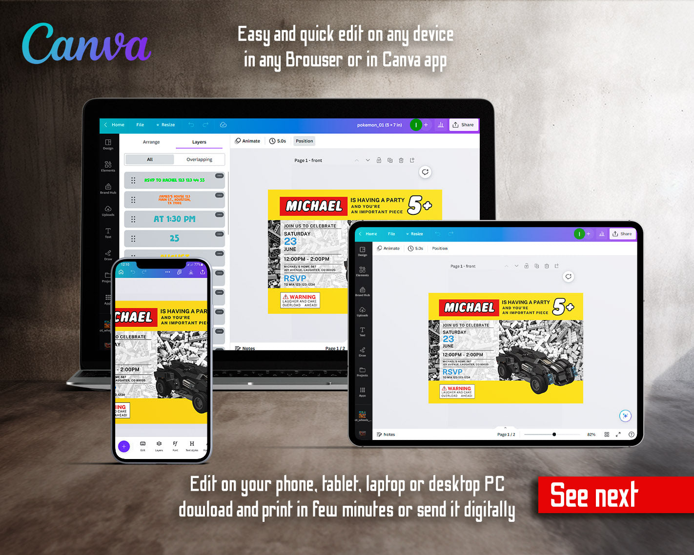 Related Tags: lego invitation, lego birthday, building blocks, race car invite, racing party, monster truck invite, editable invitation, birthday invitation, printable invitation, invite template, evite for boys, constructor invite, boy birthday