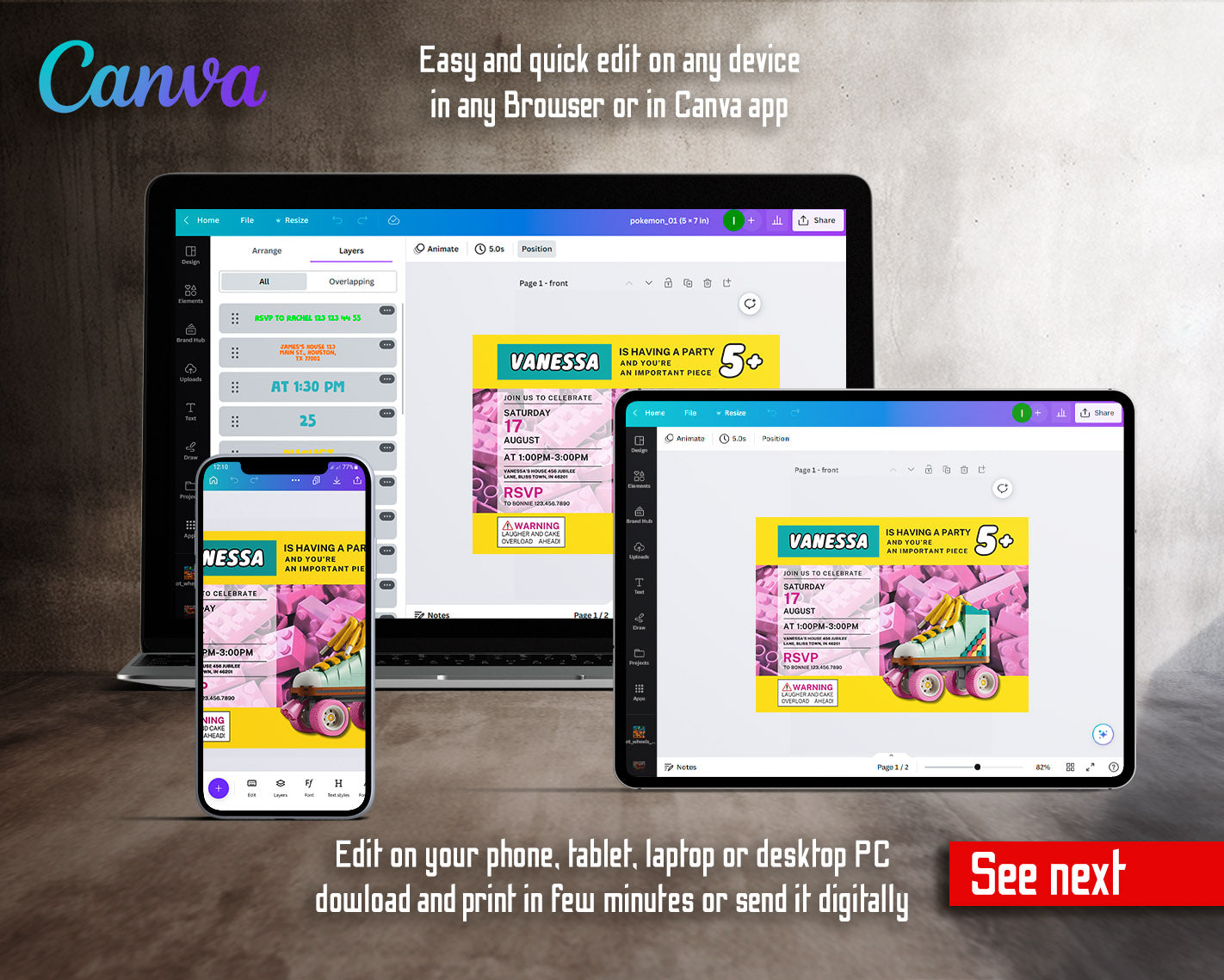 Lego Retro Roller Skate customizable invitation template | Share or Print | girl | TB018