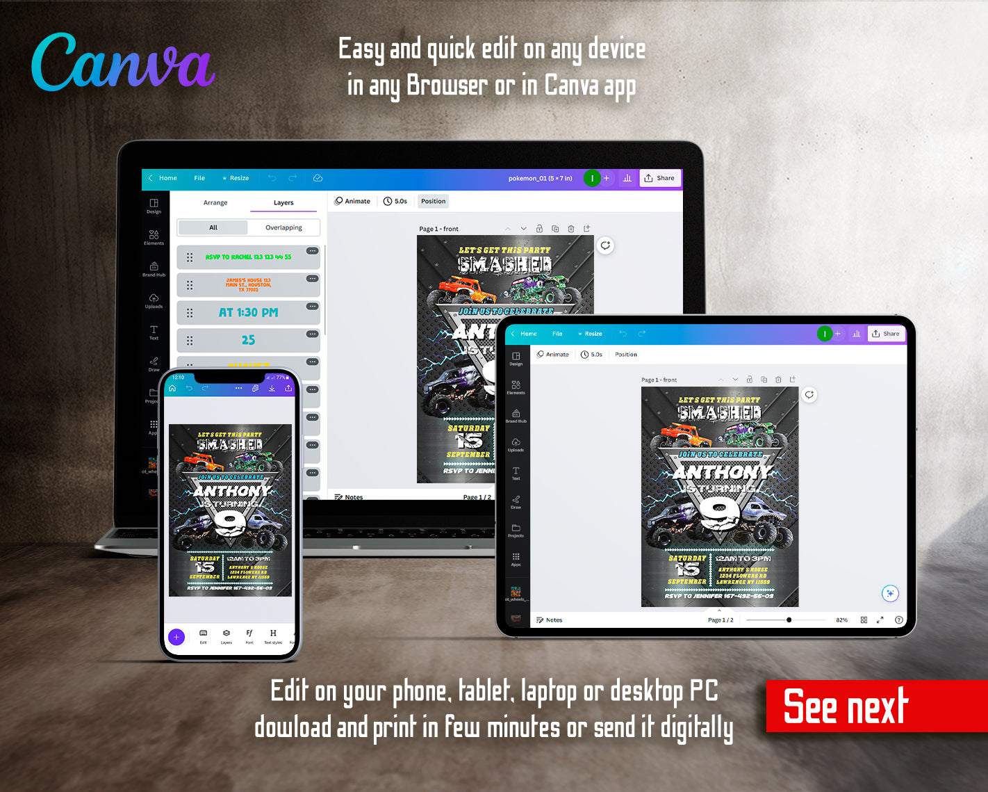 1. Invitation Template to edit in Canva ( 5" x 7" and 4" x 6" sizes), back design included;