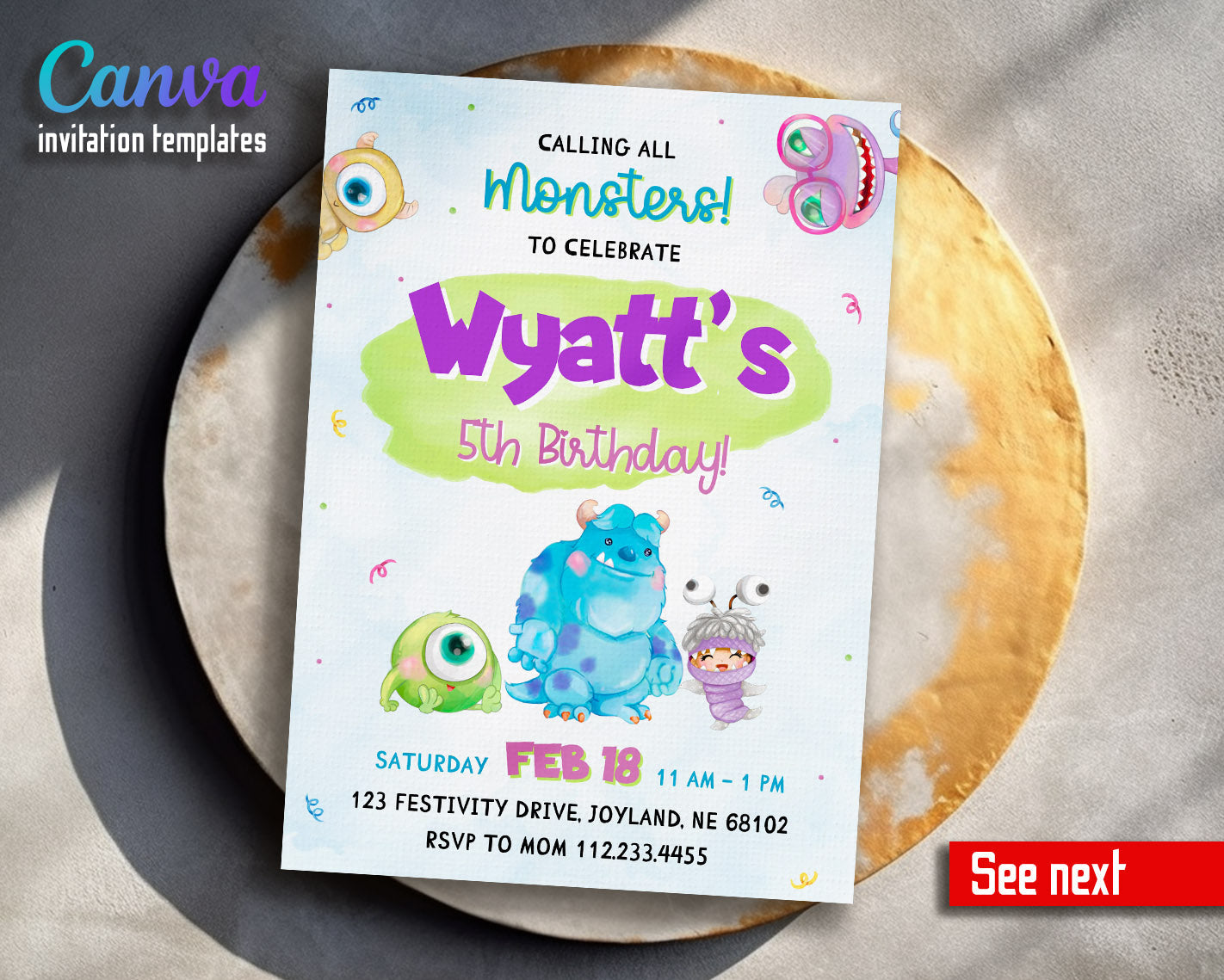 Printable Editable customizable Monsters, Inc. birthday party invitation digital template. Instant download invite.