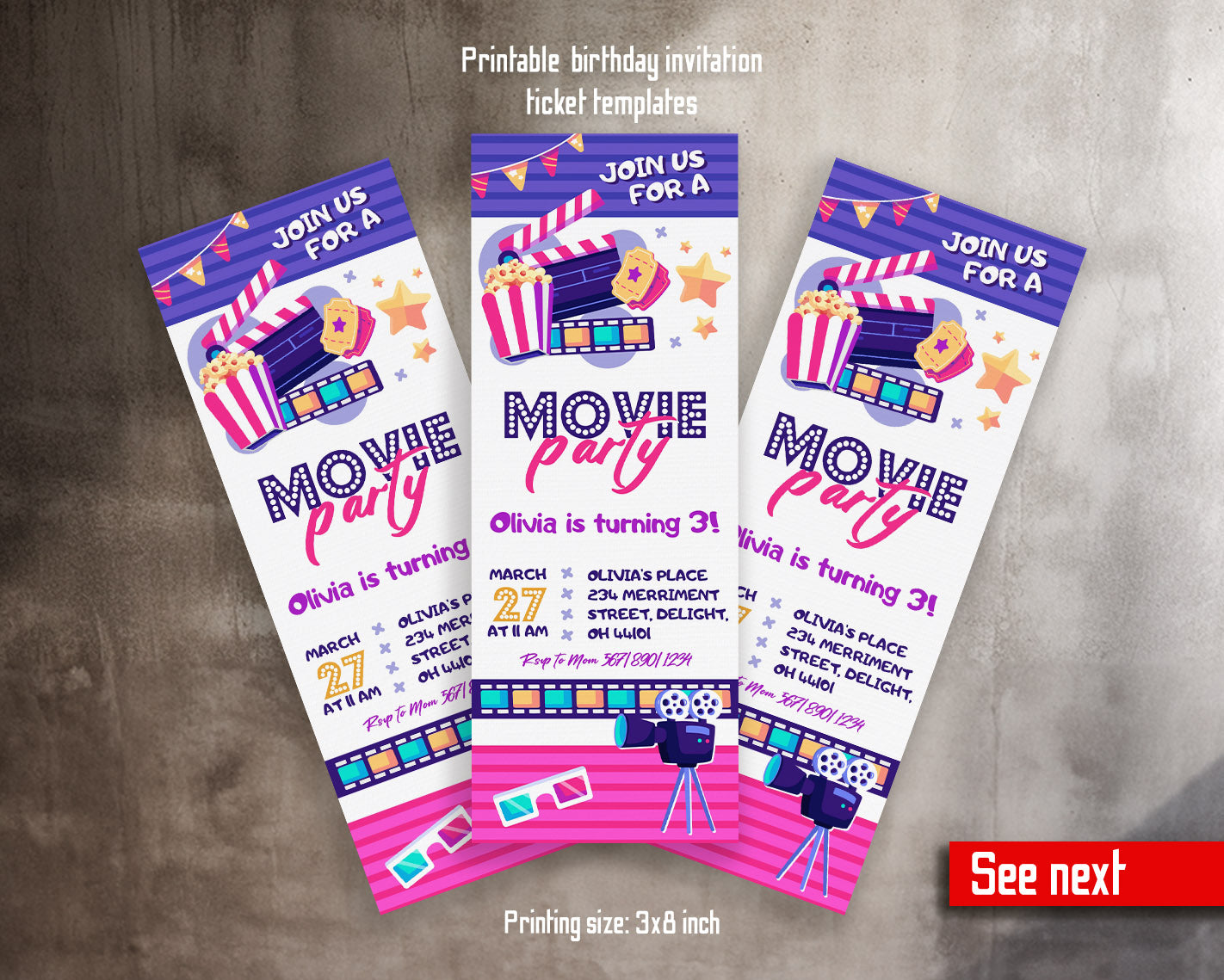 Related Tags: movie birthday, cinema invite, red carpet invite, movie party, boy girl birthday, cinema invitation, movie party ticket, ticket invitation, 1st 2nd 3rd bday, editable invitation, birthday invitation, printable invitation, popcorn invite