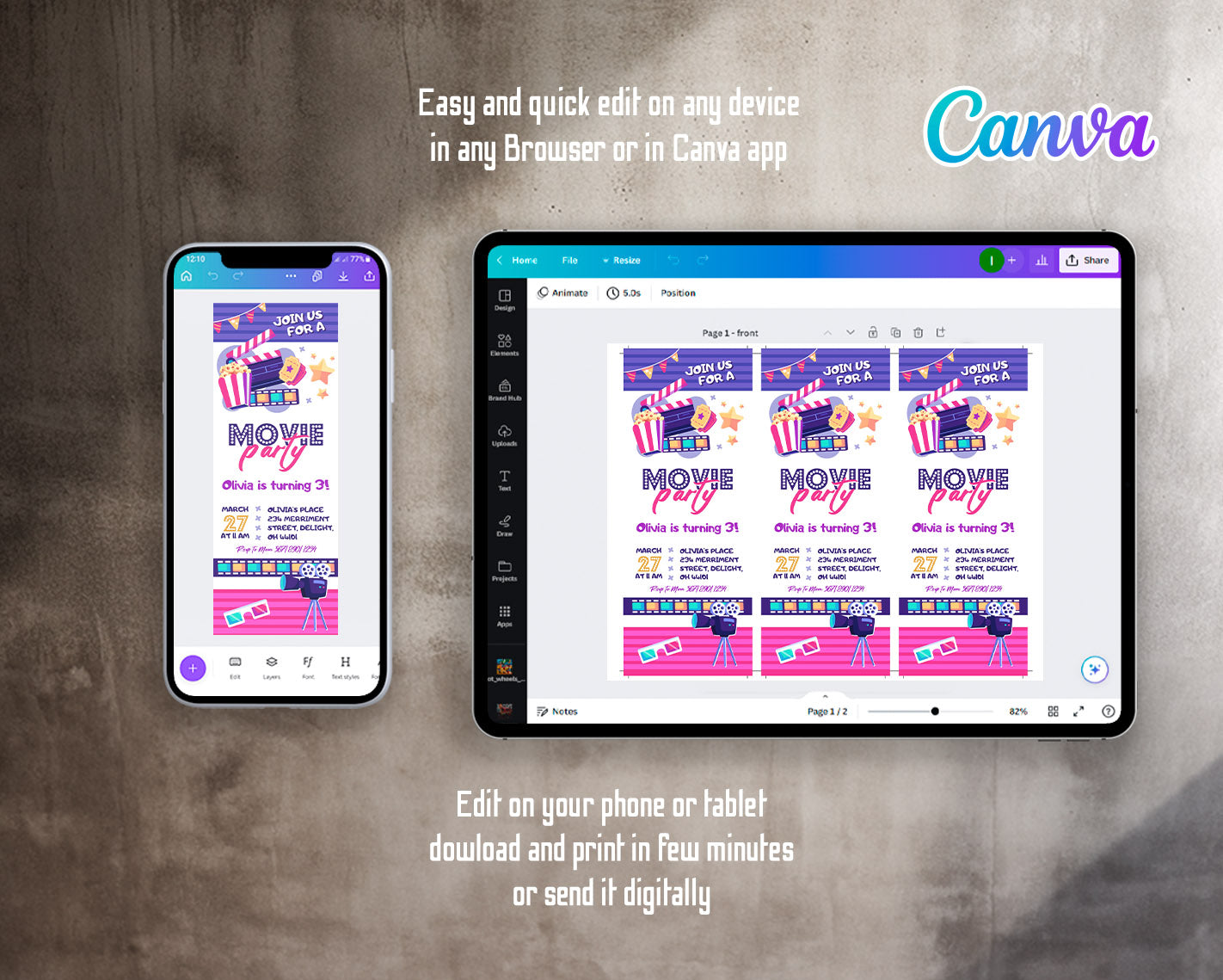 Printable Editable customizable Movie Cinema Party birthday party invitation digital template. Instant download invite.