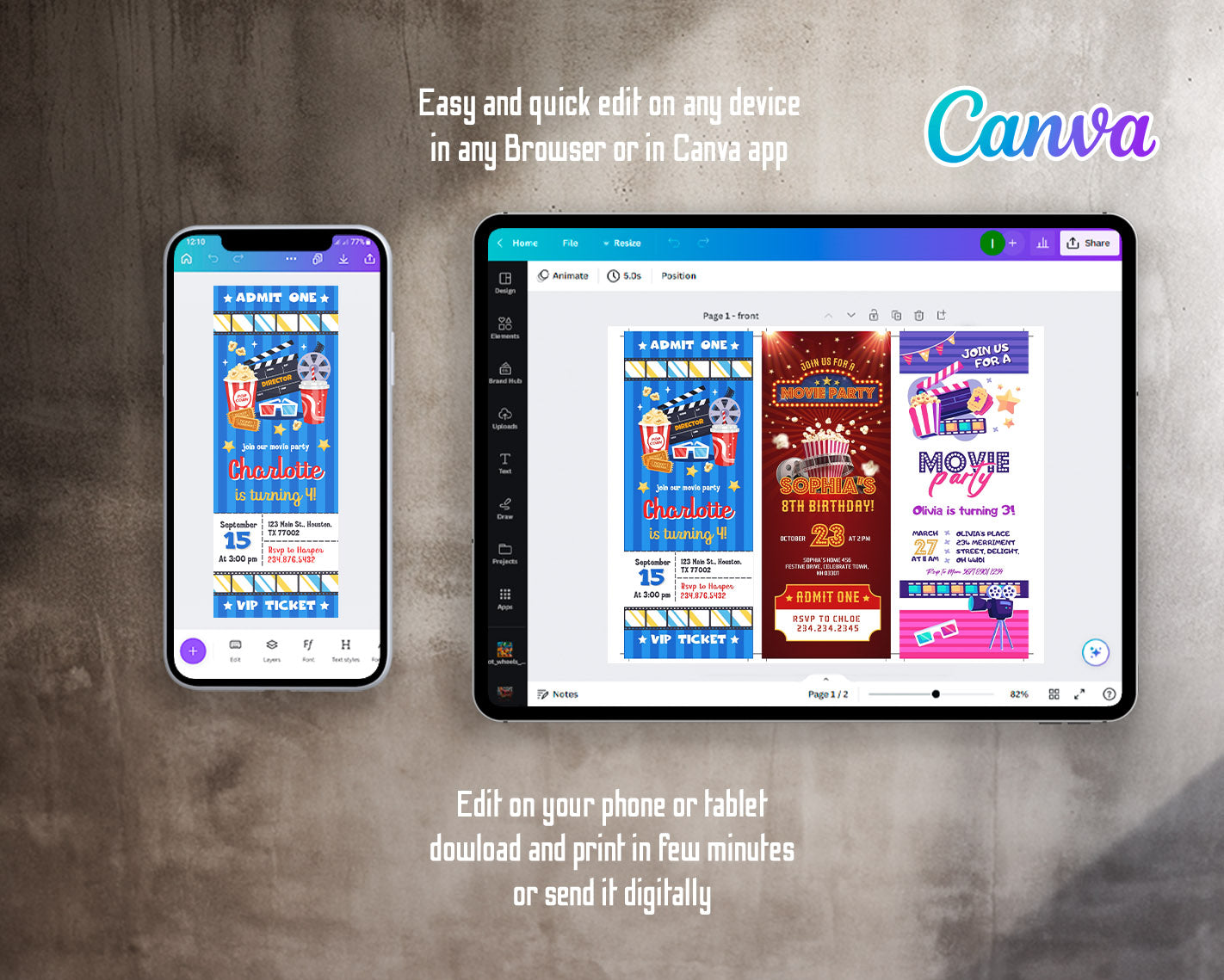 All the invitations are for self-editing. You will edit your template in Canva. It’s easy whether you're using the web browser or the app.