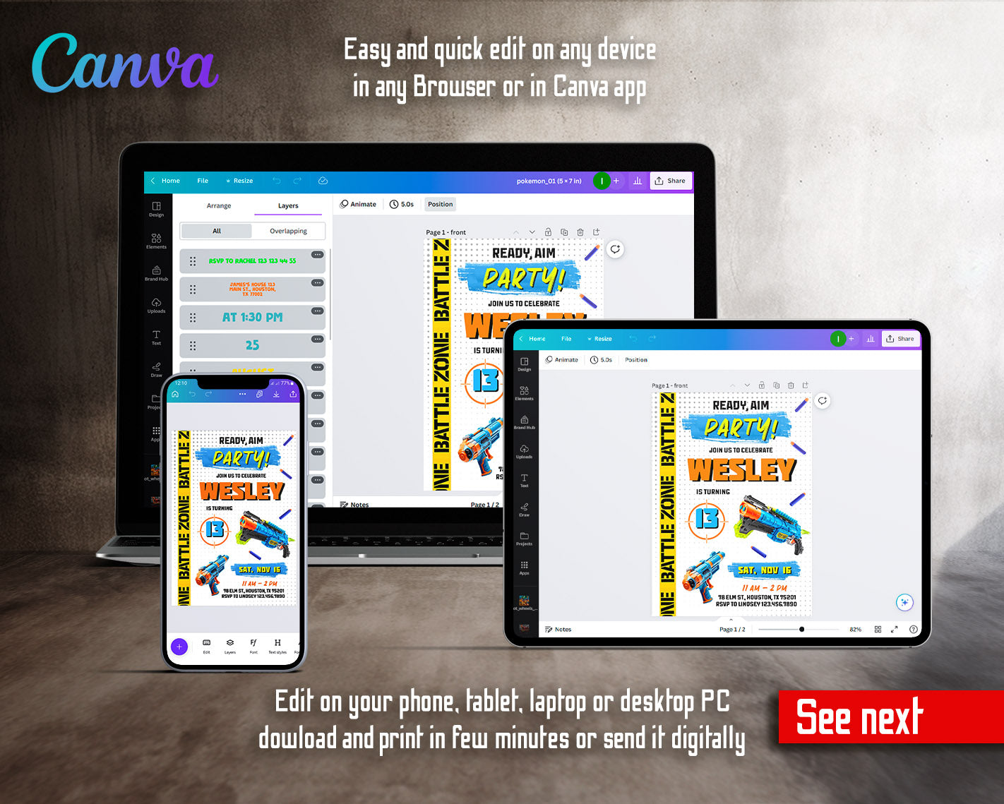 All the invitations are for self-editing. You will edit your template in Canva. It’s easy whether you're using the web browser or the app.