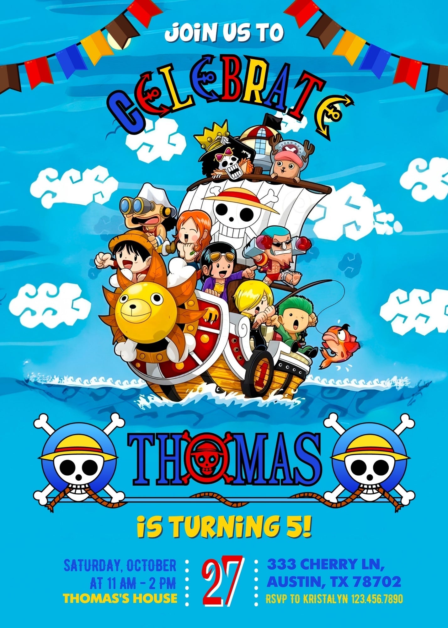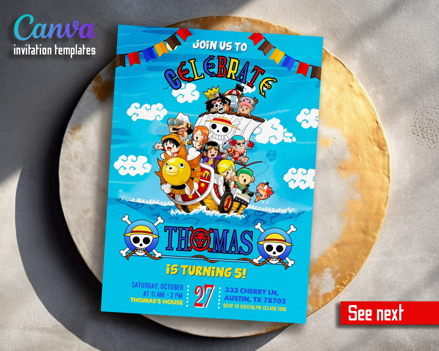 Related Tags: piece invitation, one piece birthday, Monkey D.Luffy, one piece invitation, anime party, straw hat pirat, editable invitation, birthday invitation, printable invitation, manga party invite, strawhat pirat evite, onepiece invitation, boy birthday