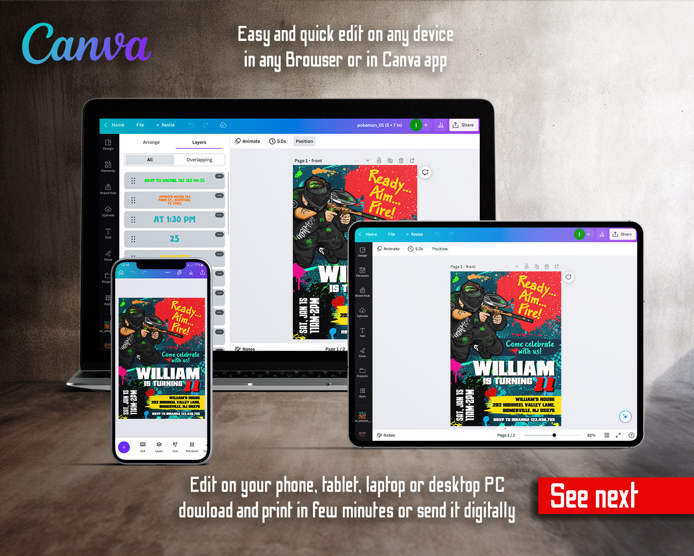 Related Tags: paintball invitation, paintball birthday, paintball invite, paint ball invite, gear up party, digital invite, editable invitation, birthday invitation, printable invitation, invite template, evite, girl birthday, boy birthday