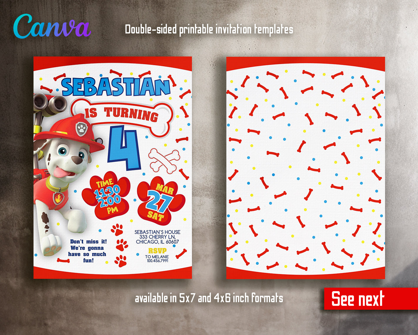 1. Invitation Template to edit in Canva ( 5" x 7" and 4" x 6" sizes), back design included;