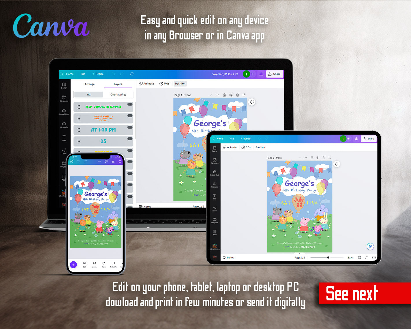 Related Tags: peppa pig invitation, peppa pig birthday, peppa pig invite, peppa invitation, peppa party, digital invite, editable invitation, birthday invitation, printable invitation, invite template, evite, girl birthday, boy birthday
