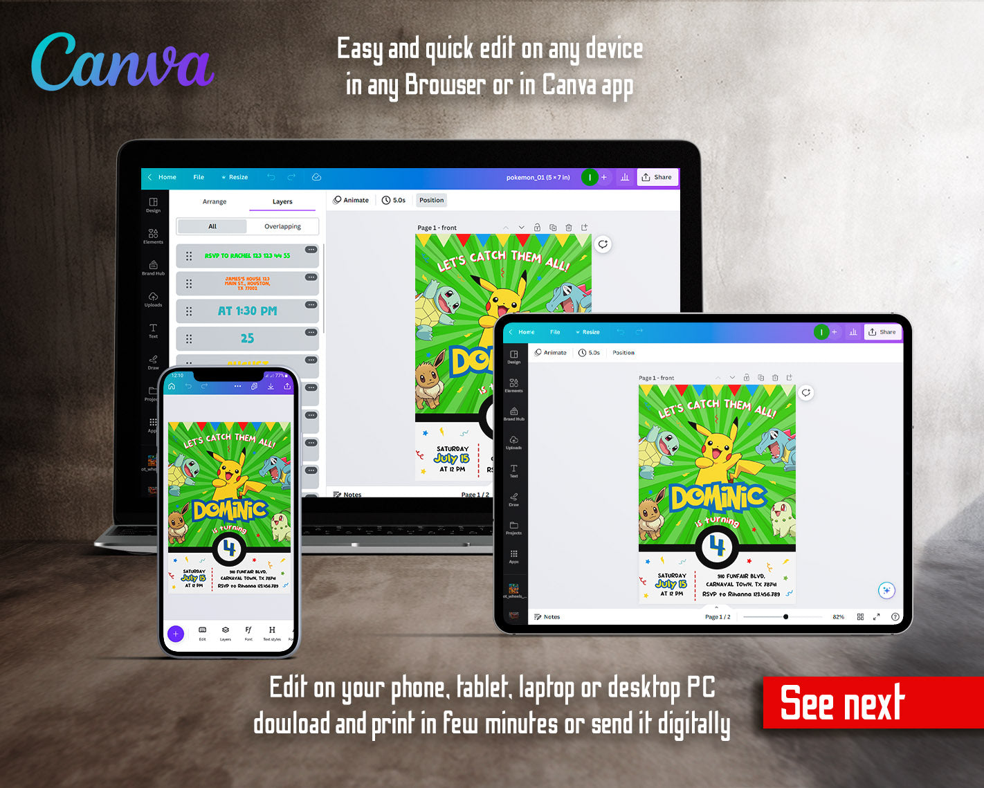 All the invitations are for self-editing. You will edit your template in Canva. It’s easy whether you're using the web browser or the app.