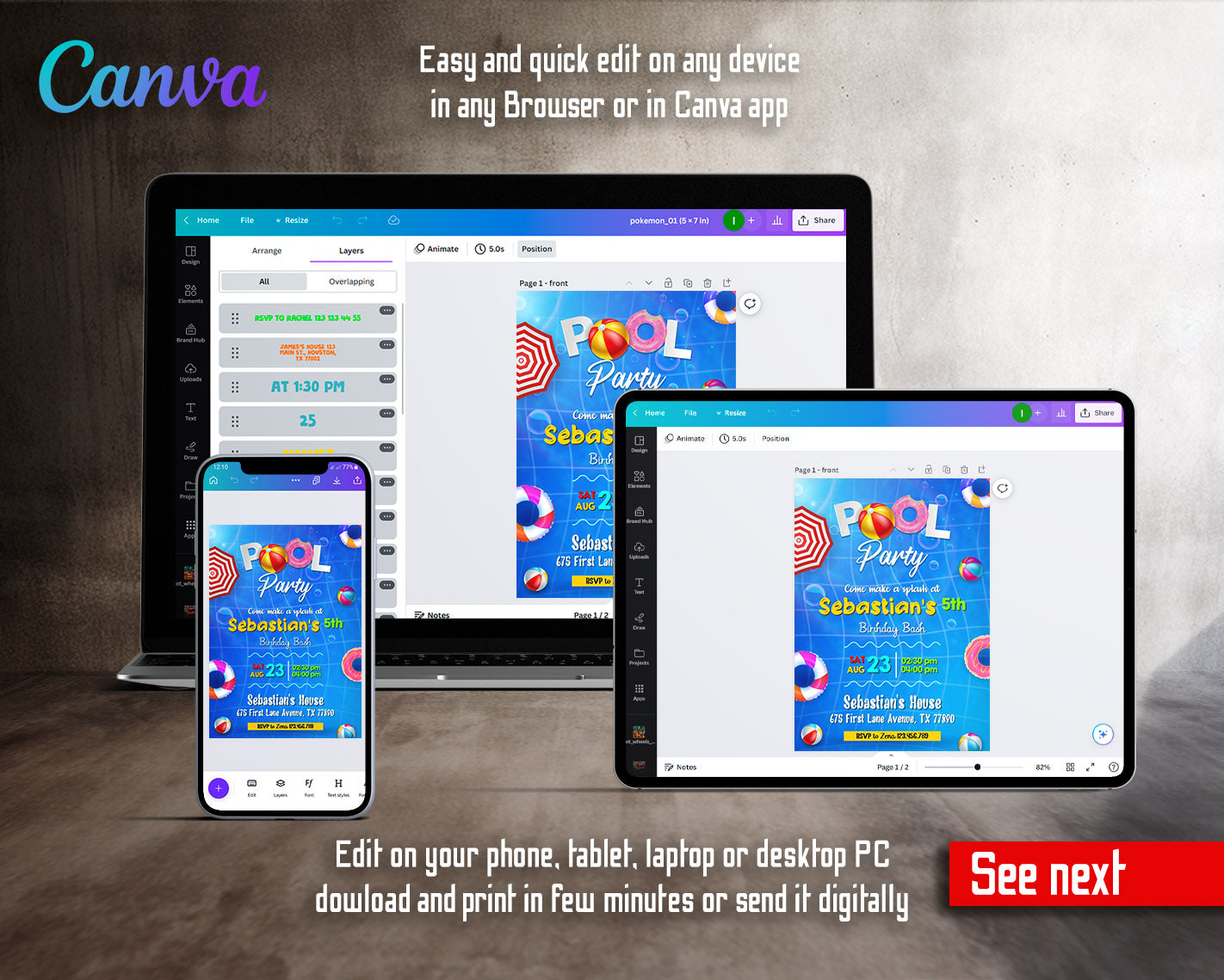 Printable Editable customizable Pool Party birthday party invitation digital template. Instant download invite.