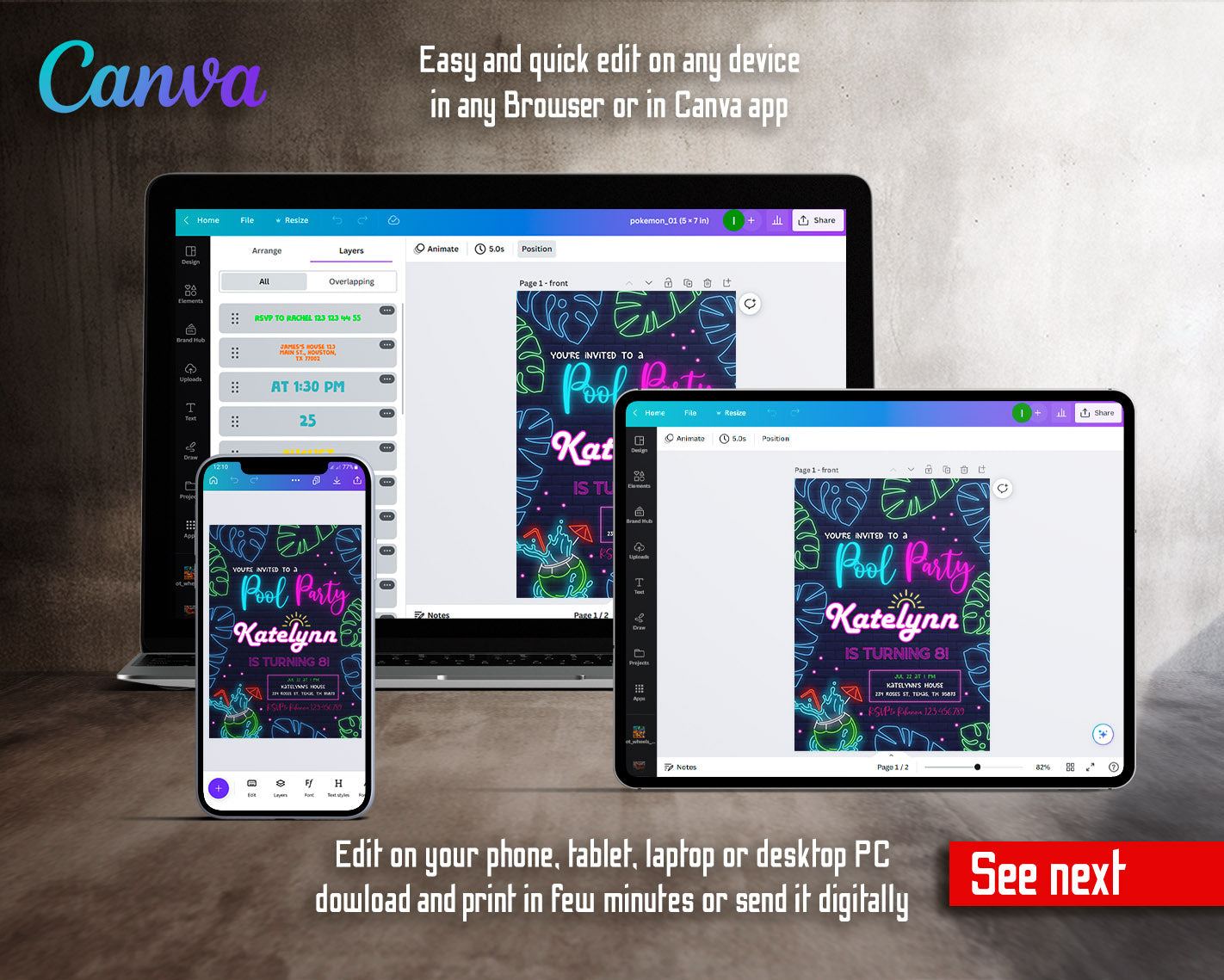 Related Tags: pool invitation, pool birthday, neon invite, pool party, neon party, Splash Pad Party, editable invitation, birthday invitation, printable invitation, hawaii tropical, evite, girl birthday, boy birthday