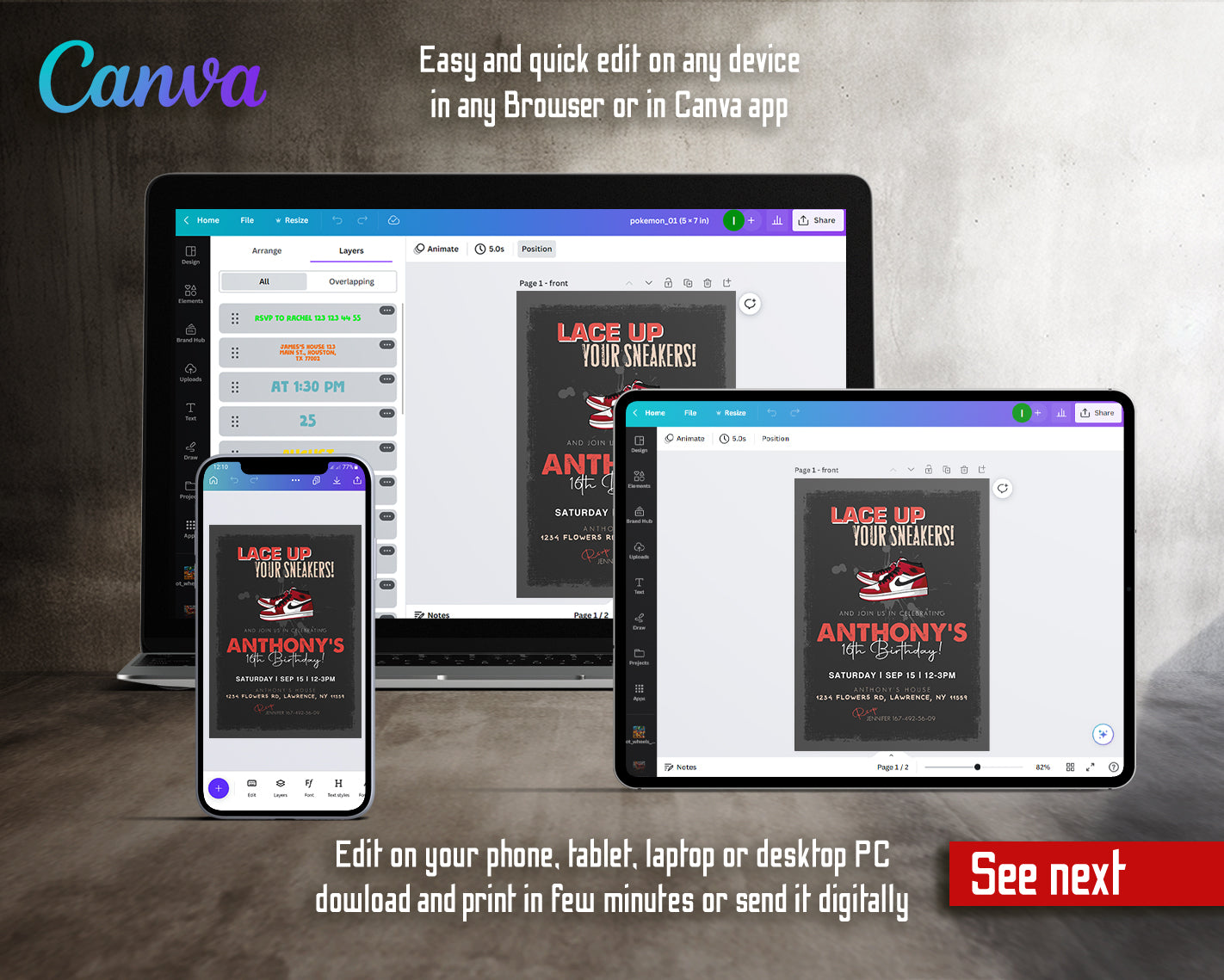 Printable Birthday Invitation, boy girl birthday invite, editable red sneaker ball invitation, Instant Download, birthday party printable