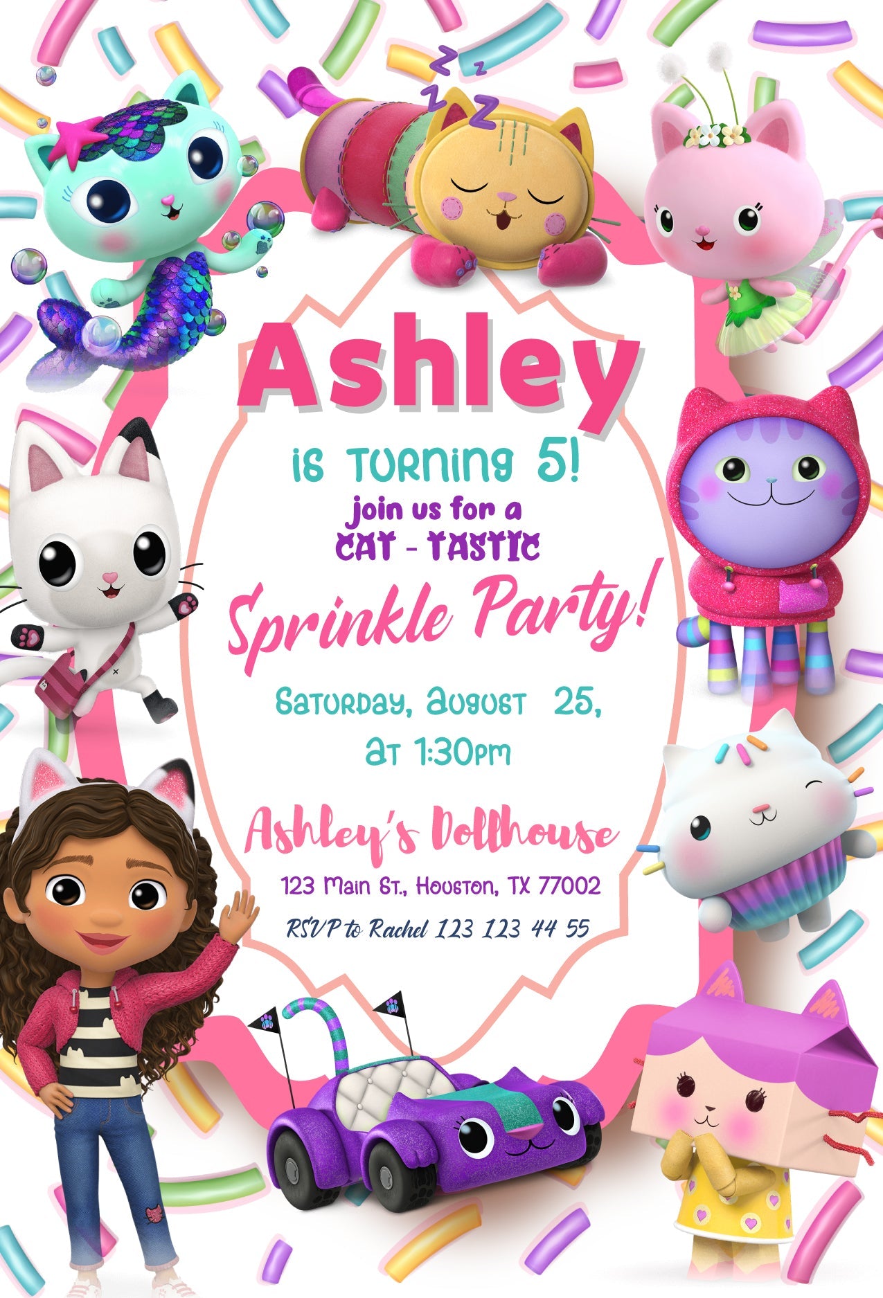Printable invitation, editable birthday invite, gabbys invitation, doll party invitation, gabbys dollhouse, gabbys party, girl birthday invitation template, kitten invitation